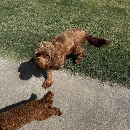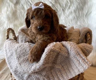 Sienna is a 15lbs F1 micro Goldendoodle. She has a sweet disposition and loves playing outside. She is very smart and aims to please.