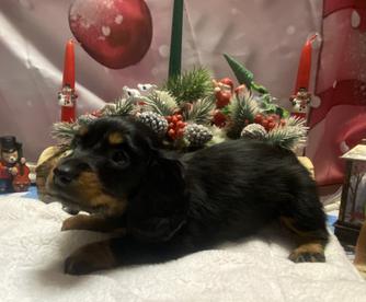 Jaxson is duel registered CKC and AKC. He is black and tan long haired dachshund. He is very small but can keep up with the rest of the dogs. He loves to play but also loves special attention.