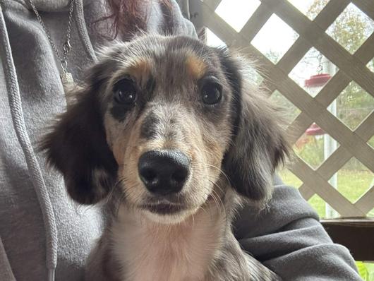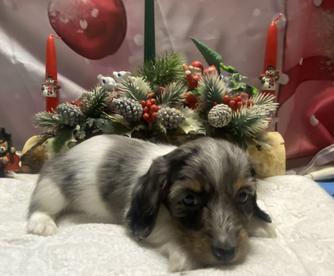 AKC registered. She is a long haired dapple. Gets along with everyone old and young. Plays but love to be held quite a bit