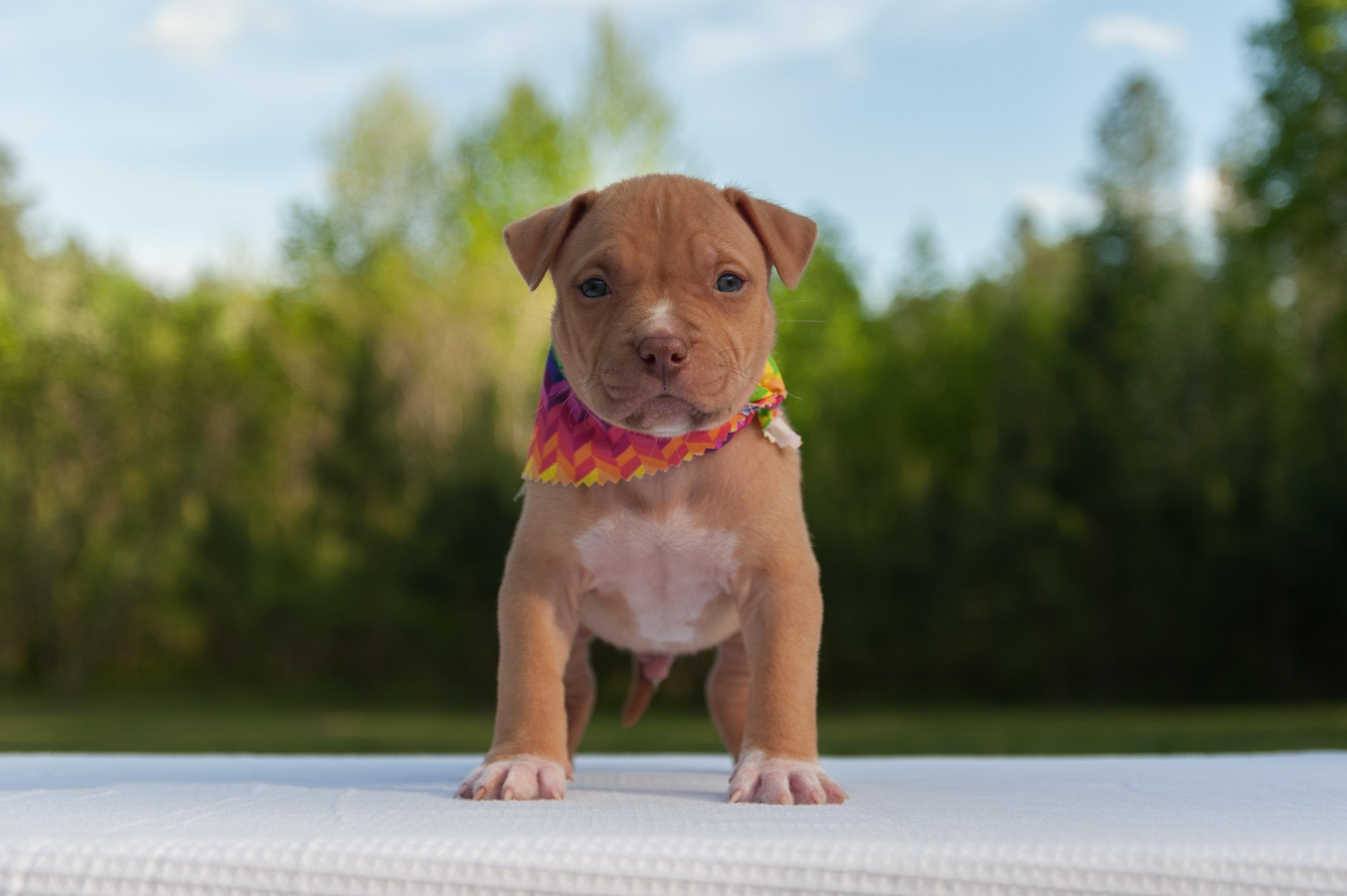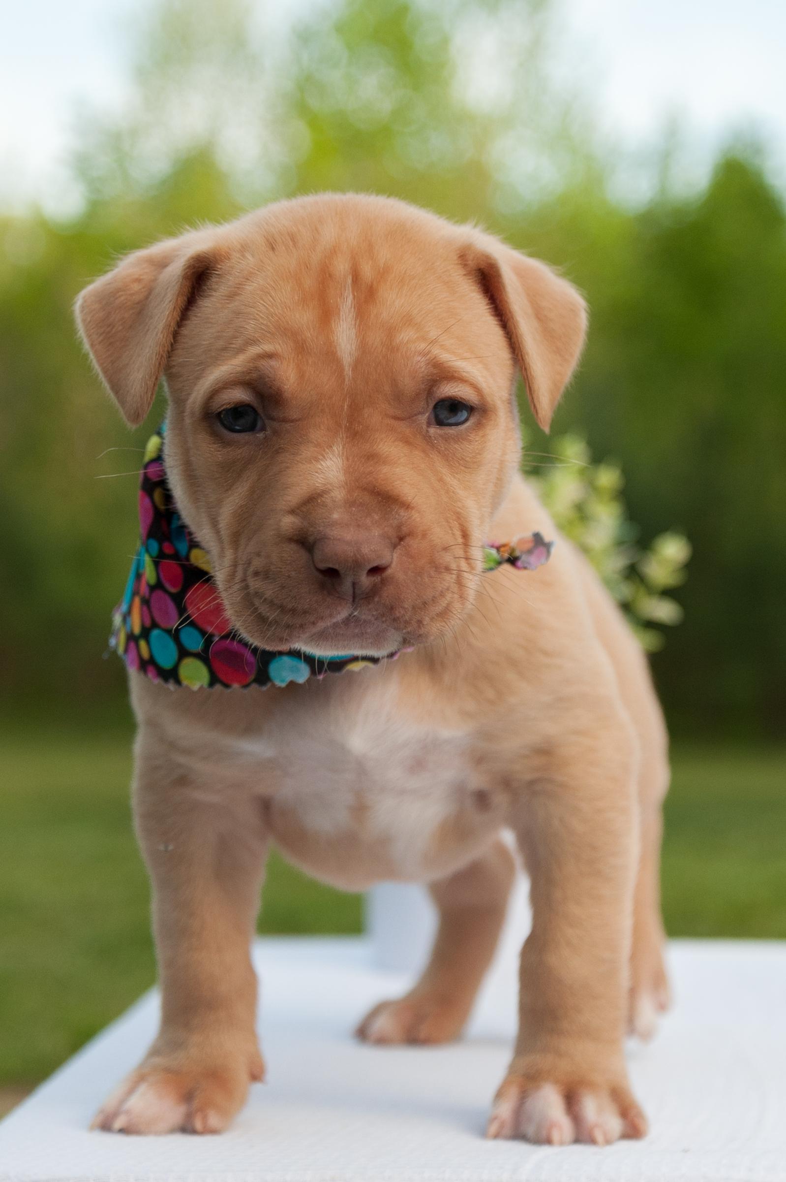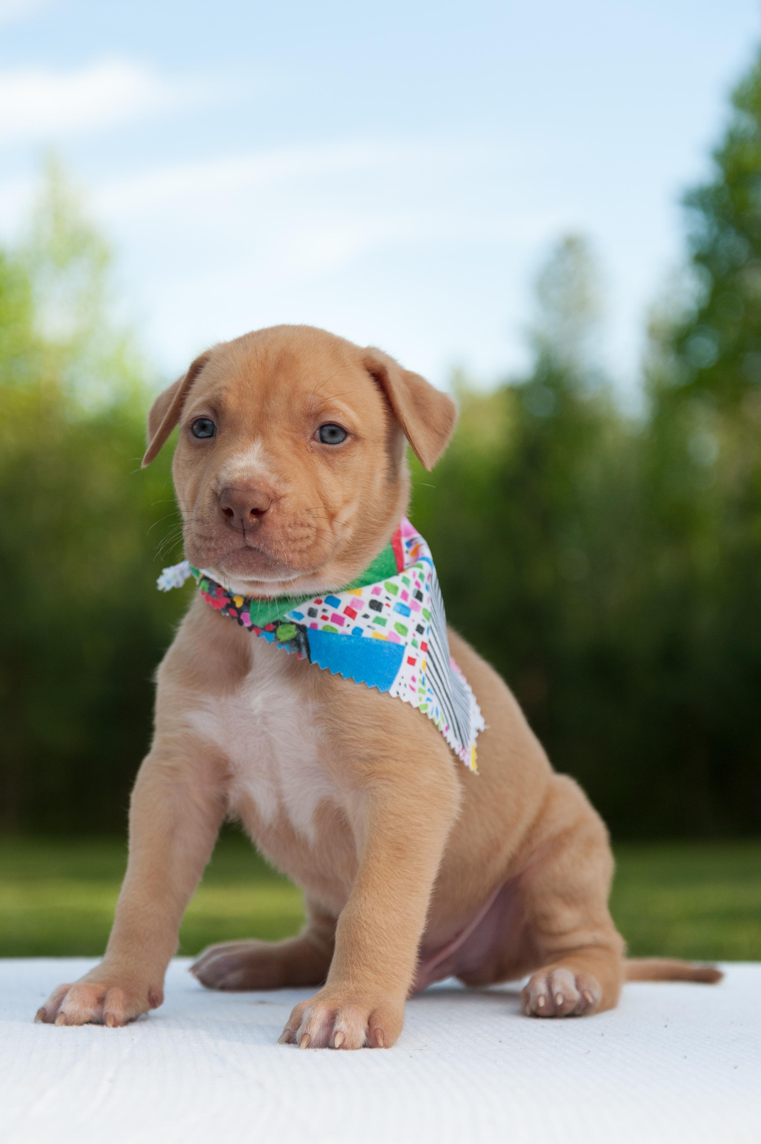 American Pit Bull Terrier puppies include red, fawn, blue fawn, blue, blue brindle, and black brindle. Colors will vary depending on the parent dogs.