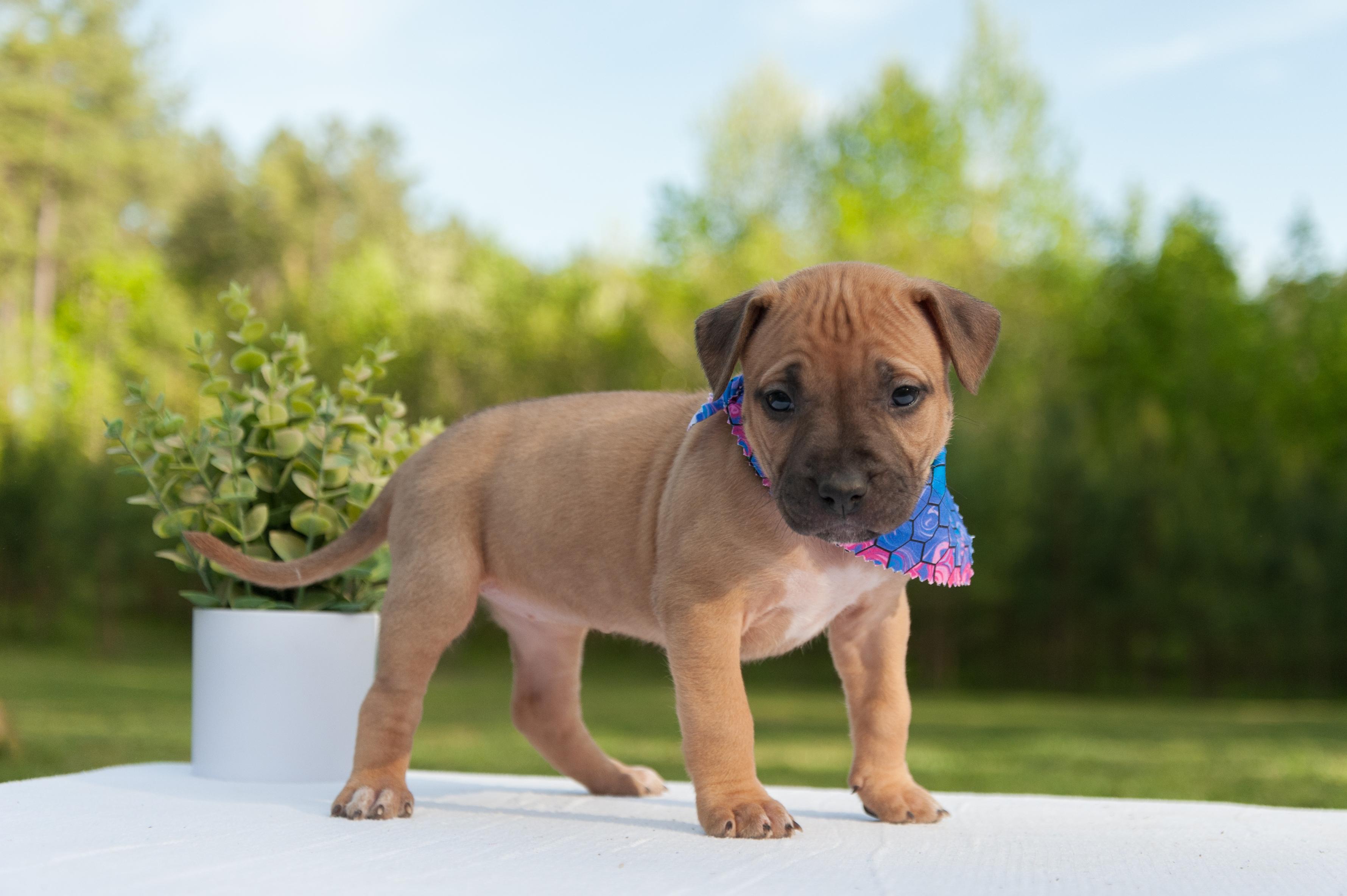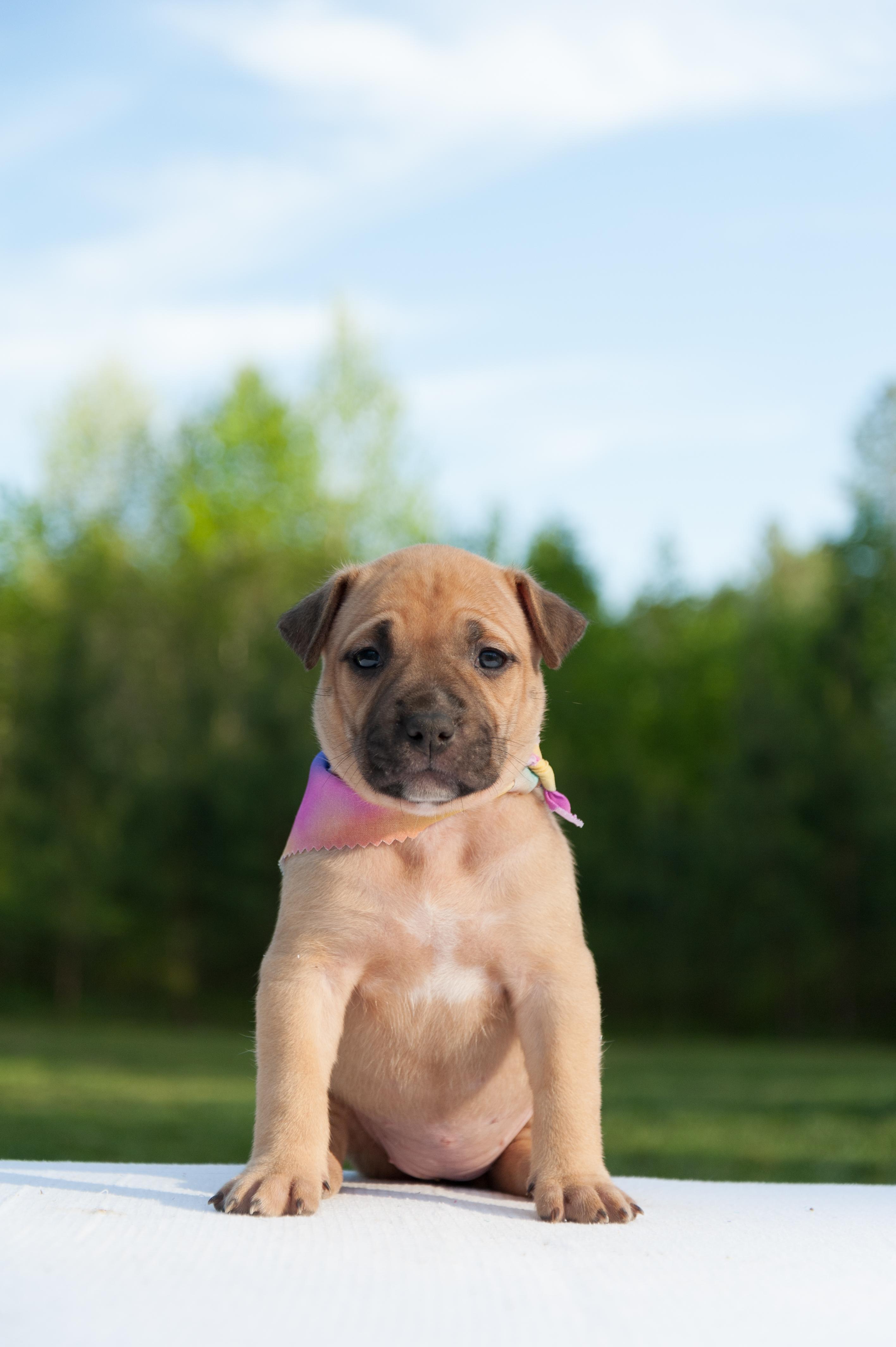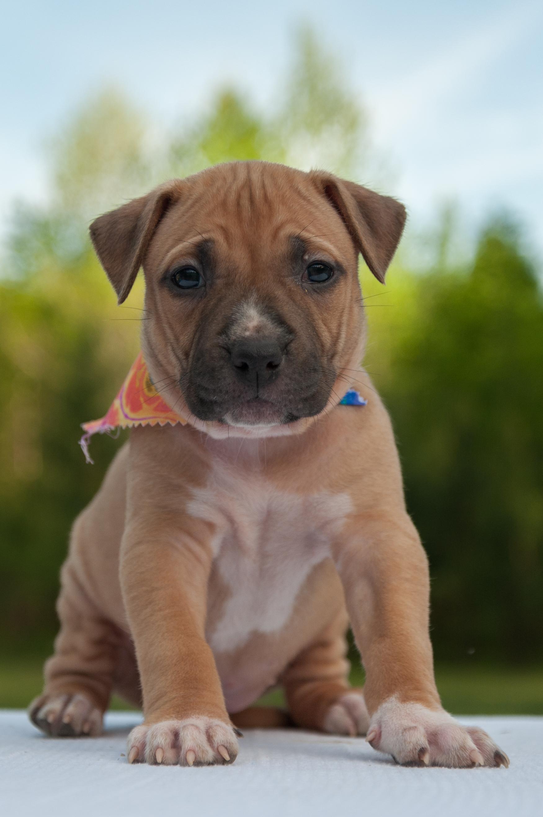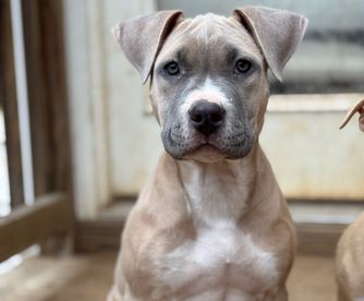 American Pit Bull Terrier puppies include red, fawn, blue fawn, blue, blue brindle, and black brindle. Colors will vary depending on the parent dogs.