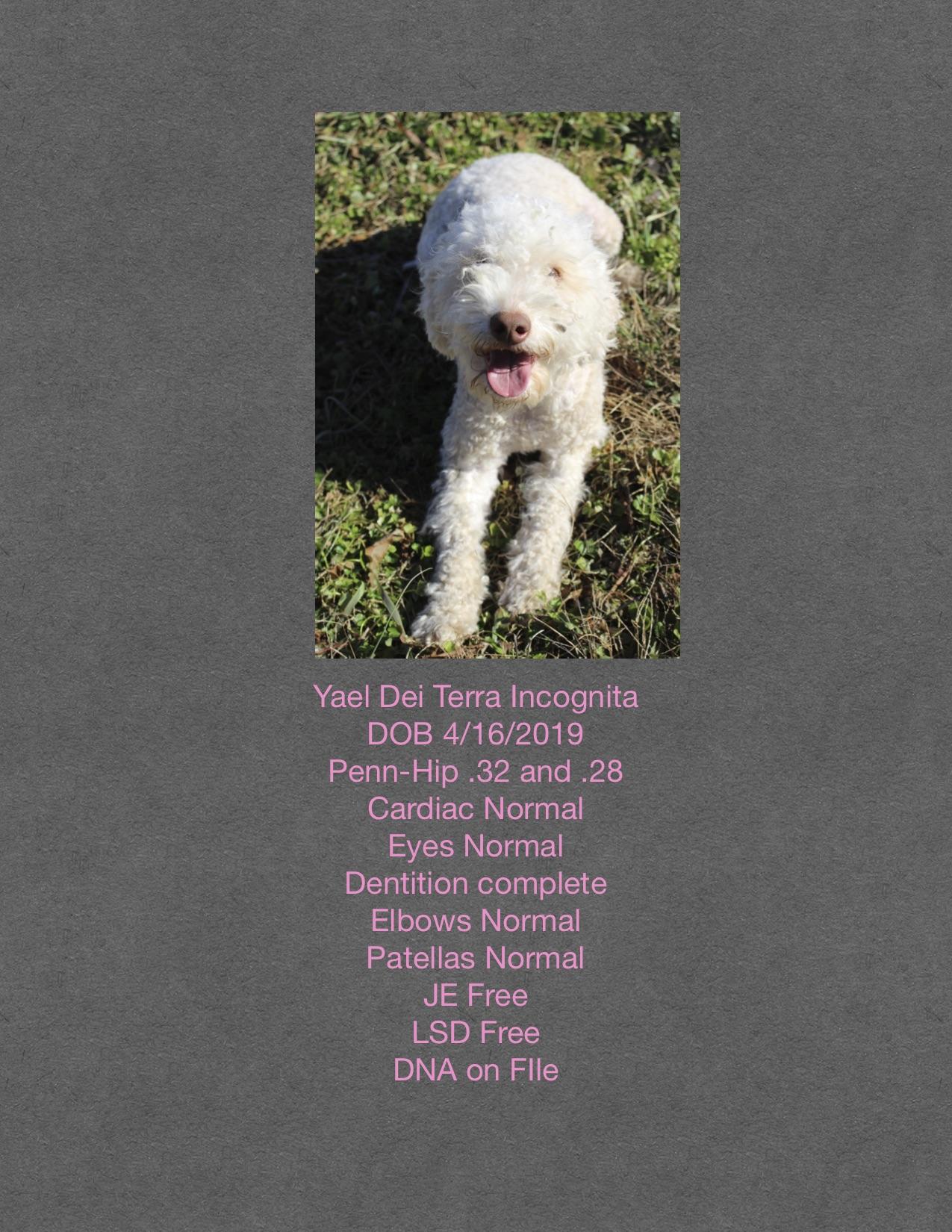 Terra Incognita reports to performing the health tests below on their breeding dogs. Ask your breeder about the tests performed on the parents of your litter. Learn more about health testing for Lagotti Romagnoli.