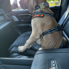 Mr. Kangaroo loves to jump like a kangaroo when he sees you coming. He immediately settles down when you get to him and waits on his hug. He is so chill, loves to be right beside you, and does great with the other dogs.