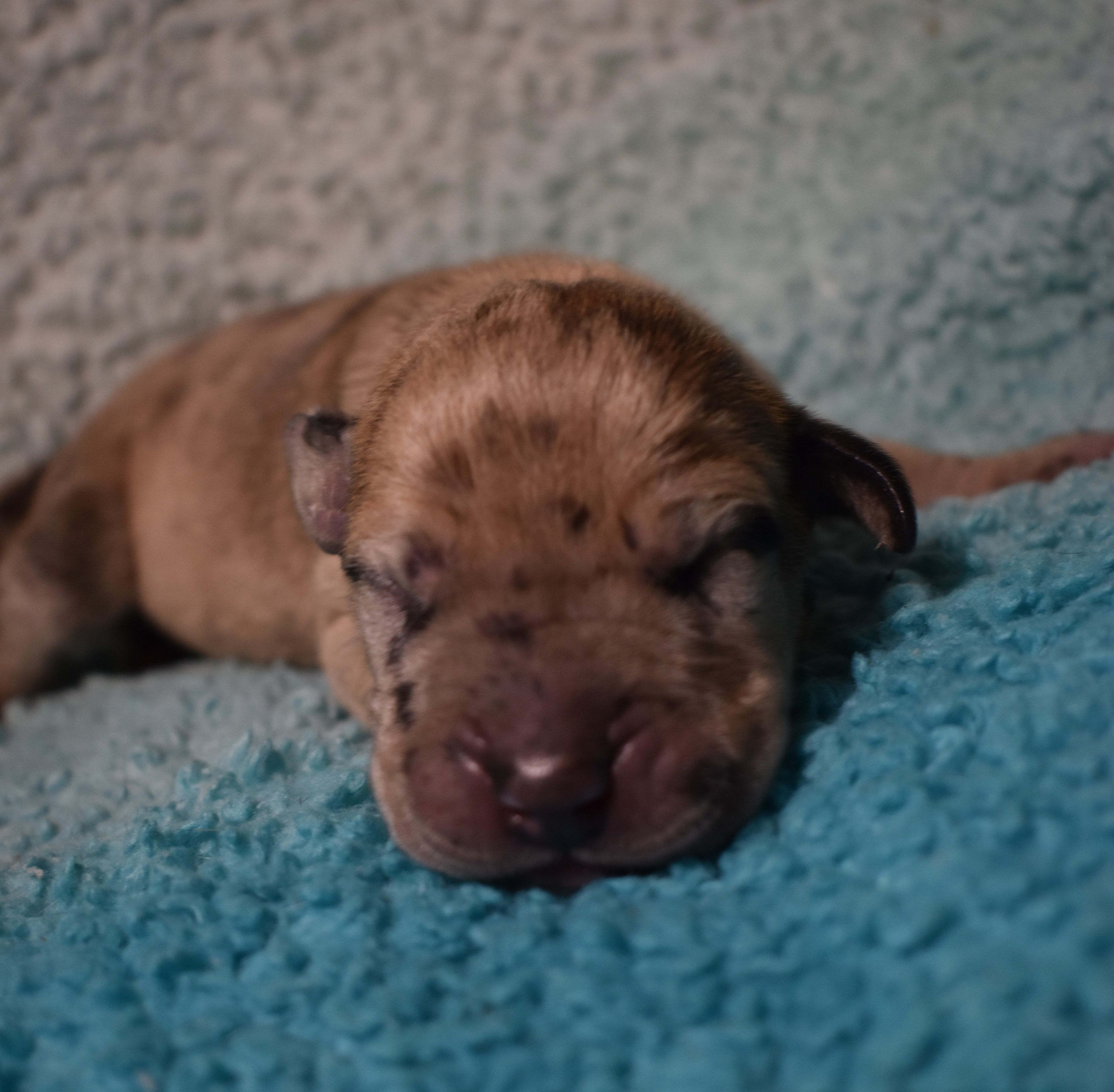 Fawnequin - Ida Mae is a very special girl. She was born as Hurricane Ida was making landfall in Louisiana then into Mississippi. I literally was tallking on my electronic device with family in LA and MS when Ida Mae was born. We were excited to get our first fawnequin female (always males in the past). My sisters insisted I name her Ida and KEEP HER!!! Thought I was going to spend the day delivering a litter and keeping tabs on my family. Annie (her mom) had a different plan. Ida Mae was a litter of "1". She was just special from the moment she arrived and still very special. She not only has beautiful coloring, she has a beautiful, loving, caring personality. She has had one litter with much success and beautiful puppies. We are supper excited about her upcoming litter.