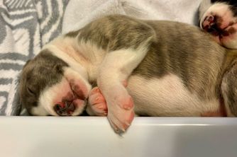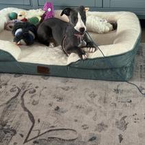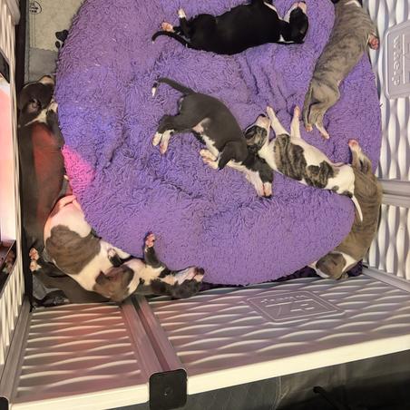 I started talking to Kye and Erin before the litter was born. I was hoping for a female white with brindle and they had one in this litter. They quickly let me know, which was just the start of being kept fully in the loop with my puppies (Iris) development. I received regular updates, text, pictures and videos. This all helped me to get a feel for my puppy before I picked her up from them in TX. The videos were very informative as to how they were housed, behaved etc. Most telling for me was the family outing to the vets video. Mom was not at all phased by being at the vets with her 8 puppies. She has a bulletproof temperament. I found a great benefit from the pups all being reared in a family home. Iris did great with a crate, riding in a car, pee pads, potty training, I was even shocked to find out she could sit for a treat when I tried that for the first time. Kye and Erin give these pups great base training for you to work from. I got good communication on what Iris daily schedule was, food amounts, type etc. Everything we needed to get her integrated into our life with minimal changes to start with. She was very easy to introduce to my partners two dogs and cats. We also had no issues getting her to sleep in a crate following the advice Kye and Erin gave.