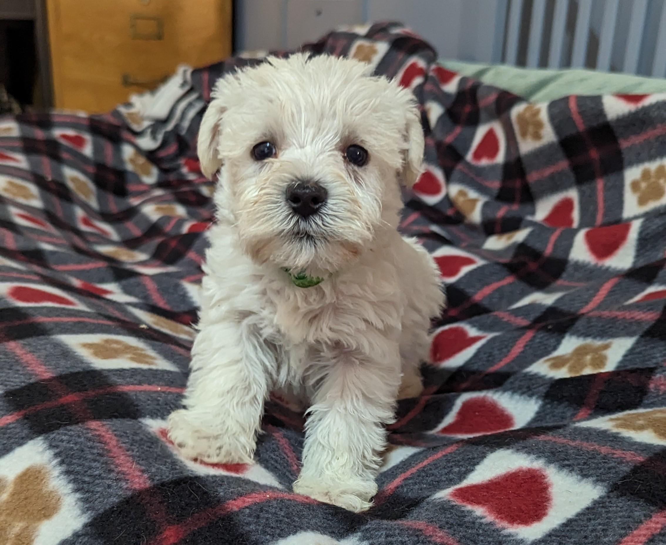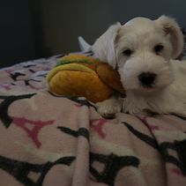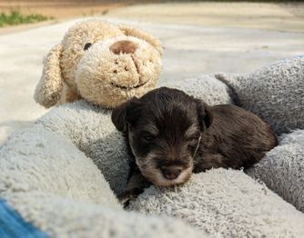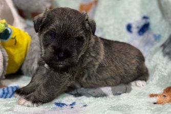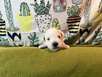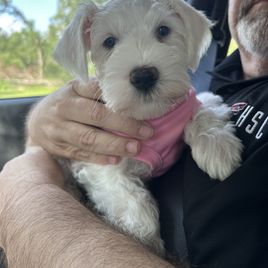 Maxx is the sweetest puppy ever! He is very loving and very smart. He understands being told to go get a drink of water or go eat! He is a little mouthy and likes to chew or taste a lot of things he sees but we are working on that and potty training. He doesn't like to be separated at night but since he's not completely potty trained, I keep him in a fence with a carrier to sleep in if he wishes. He doesn't cry anymore at night at bedtime and has accepted it's time for sleep. He looks exactly like I wanted a new schnauzer to look and we are enjoying him so much. Sharon and Taylor were a delight and actually delivered him to us with all the pertinent vaccine info and registration papers to be sent in. We liked them very much and absolutely this is NOT a puppy mill which was very important to us! Would highly recommend if you love a schnauzer!