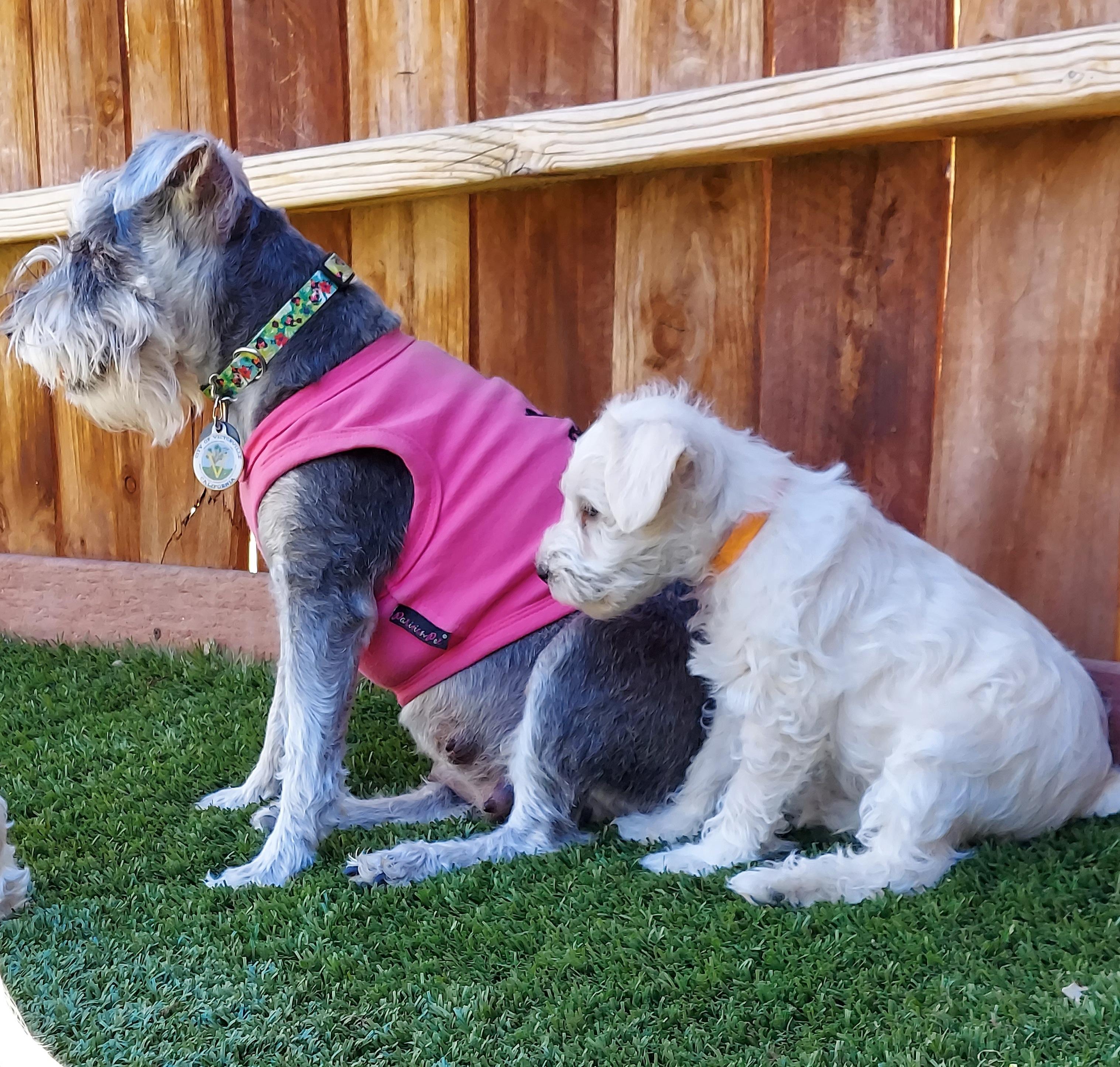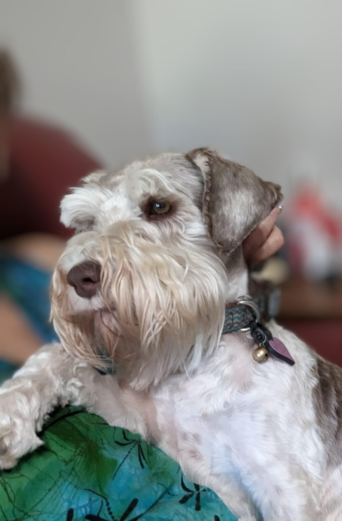 Just as sweet as her name Mable Syrup ( liver/tan) is on the small end of the size scale for a mini Schnauzer at under 12 pounds. She is our youngest girl that is sassy, smart and super sweet!