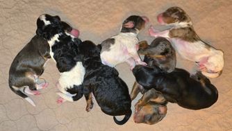 “All pups are sold with a health guarantee, UTD shots, vet check & from genetically health tested parents. Pups are litter box, dog door trained & have been handled & loved from the day they arrived! Deposit is non-refundable but may be transferred to another litter. I make no guarantees that the same dogs will breed again.”