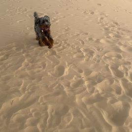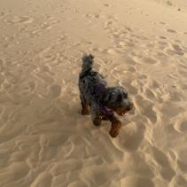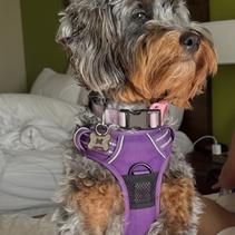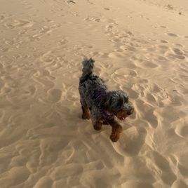 Sammie is a big dog in a little package. She loves riding around the ranch in the ranger and going on long walks. She is calm and relaxed in the house but always ready for an adventure. She prefers sleeping curled up by our feet rather than on the couch. She let's us know when anyone arrives but not a barker. She greets everyone at the door with a toy in her mouth