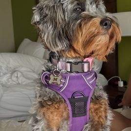 Wiggles is my sidekick and constant companion. She is always ready for a long walk or a car ride - really anything that I am doing, she wants to tag along. She is calm and content in the house with us and also loves running around with her pals outside. She is super smart, has excellent recall and love to please.