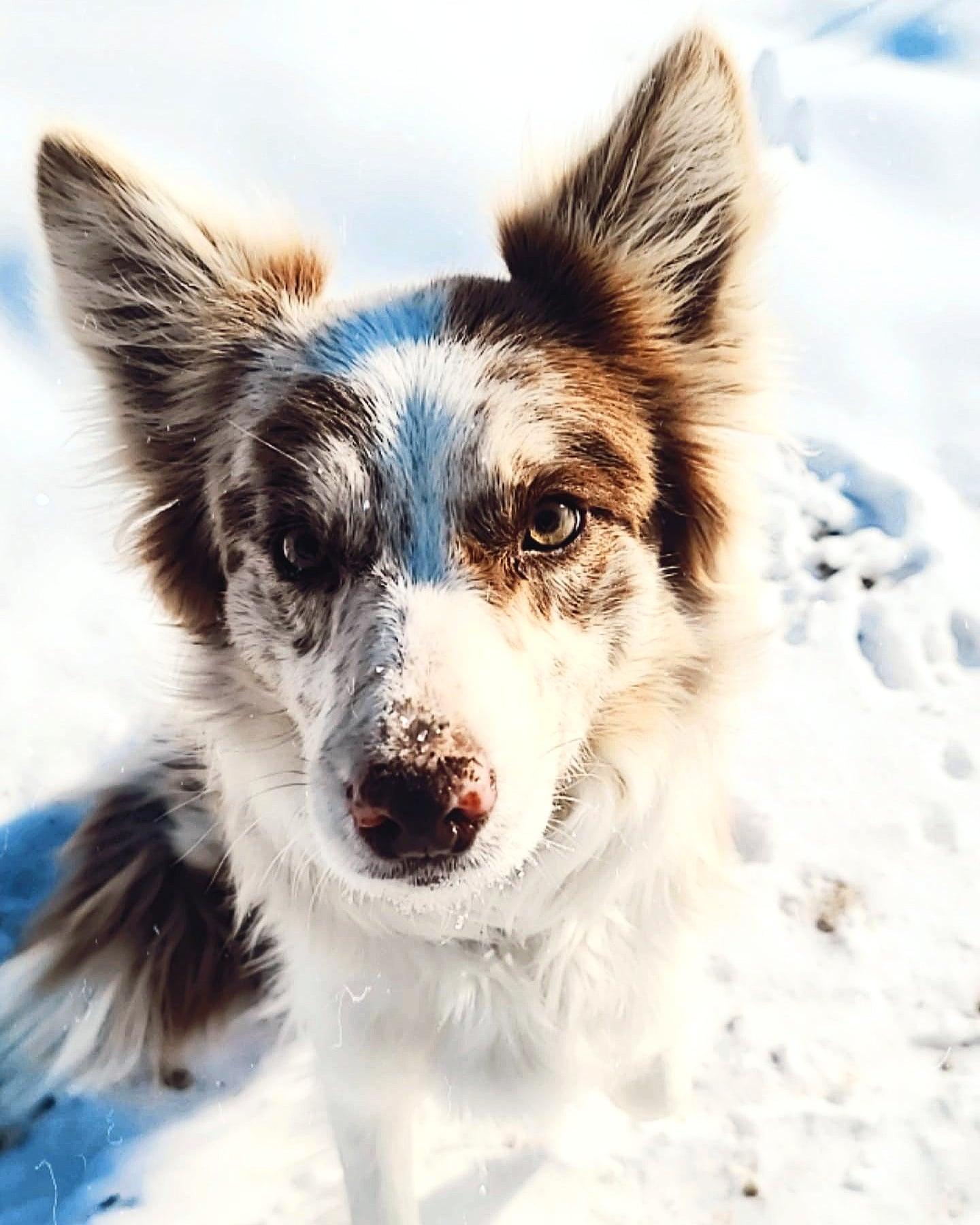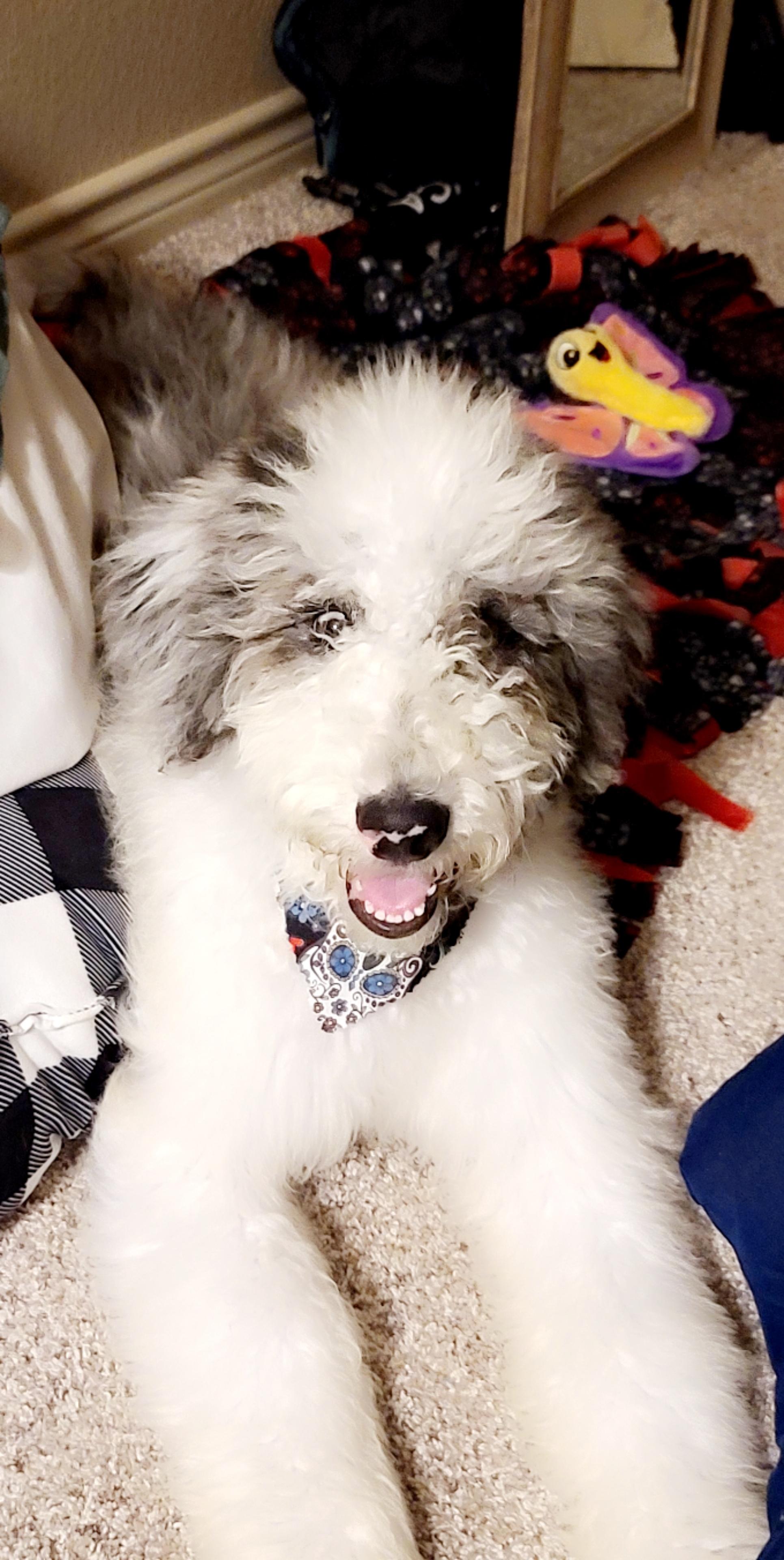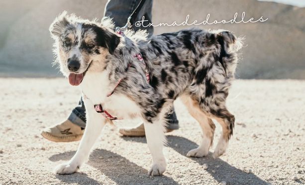 Lima is a gorgeous blue merle parti F1 Aussiedoodle with 2 marbled blue eyes! She is stunning and the smartest dog I know. She loves her people and is very loyal and trusting! She learns tricks within minutes!!