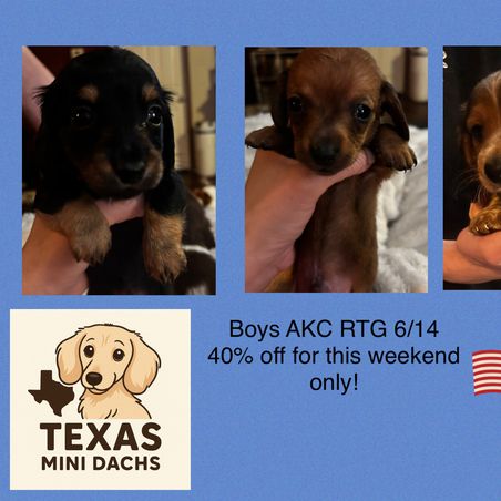 I'm Bonnie P., the breeder behind Texas Mini Dachs located in Blue Ridge, TX. We work hard to produce healthy, well-rounded Dachshund puppies that will make others as happy as our dogs have made us! We are a simple, family-run breeding program offering loving and loyal companions to others. We focus on quality care and health with each litter we raise.