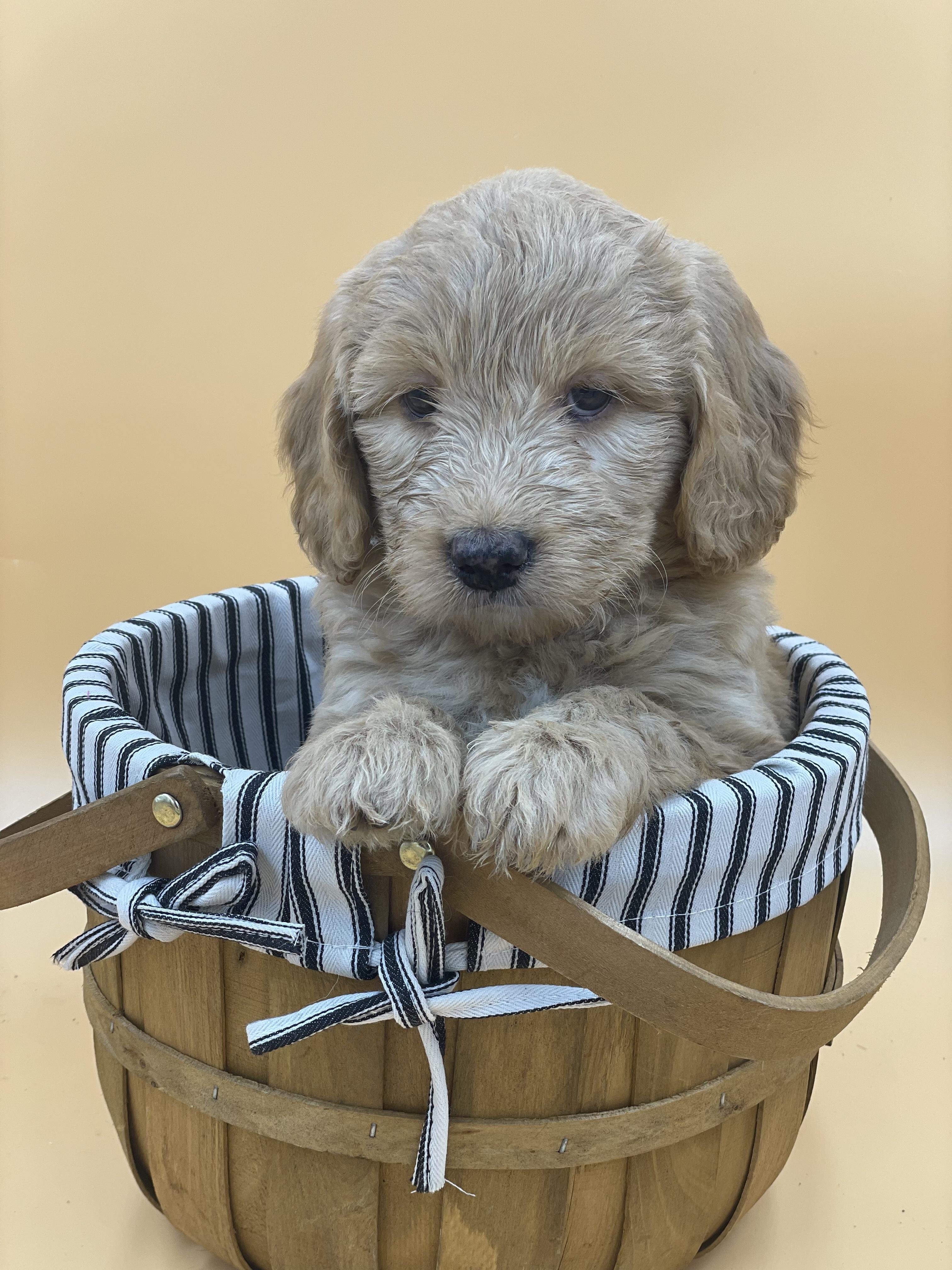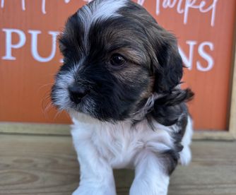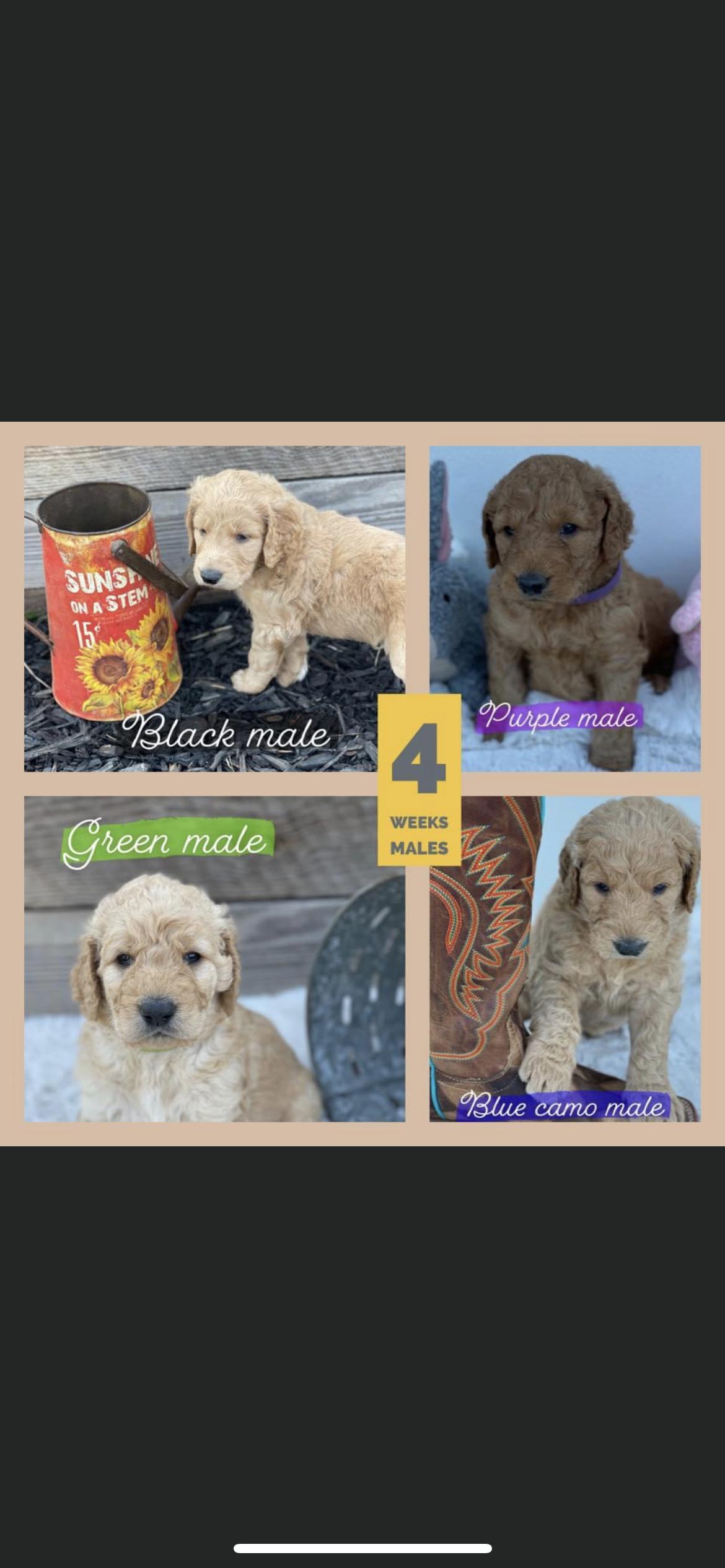 Our Goldendoodle puppies include cream, apricot, and merle. Cavapoo puppies are blenheim. Shihpoo puppies are black and white. Colors will vary depending on the parent dogs.
