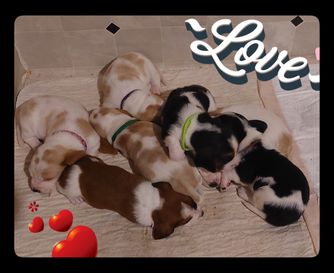 Our puppies include white black and red, red and white, blue and white, black white and tan, tan and white, mahogany and white, lemon and white, brown black and white, blue tan and white, black white and brown, black red and white, and black brown and white. Colors will vary depending on the parent dogs.