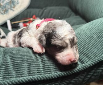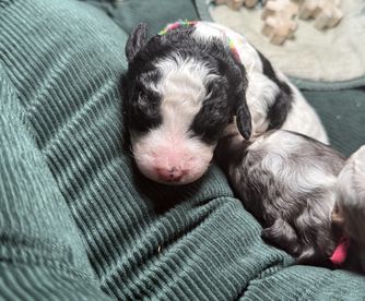 The petite bernedoodles are 8 weeks old