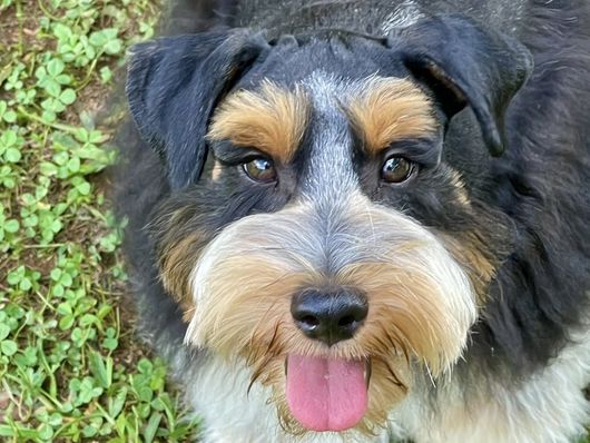 Mikey is the epitome of perfection. He is many generations of careful breeding brought together for the perfect storm. Mikey is a black and red blanket parti roan w/ticking. He’s an absolute joy. The perfect size of 15 pounds with beautiful conformation. He rarely barks. His personality is calm, easy to please and always waiting for his command. A happy happy boy who gets along with everyone. His favorite activities are wrestling and playing tug-of-war around the yard with his best friend Angel. He has been DNA tested, 100% Schnauzer and 100% health clear.