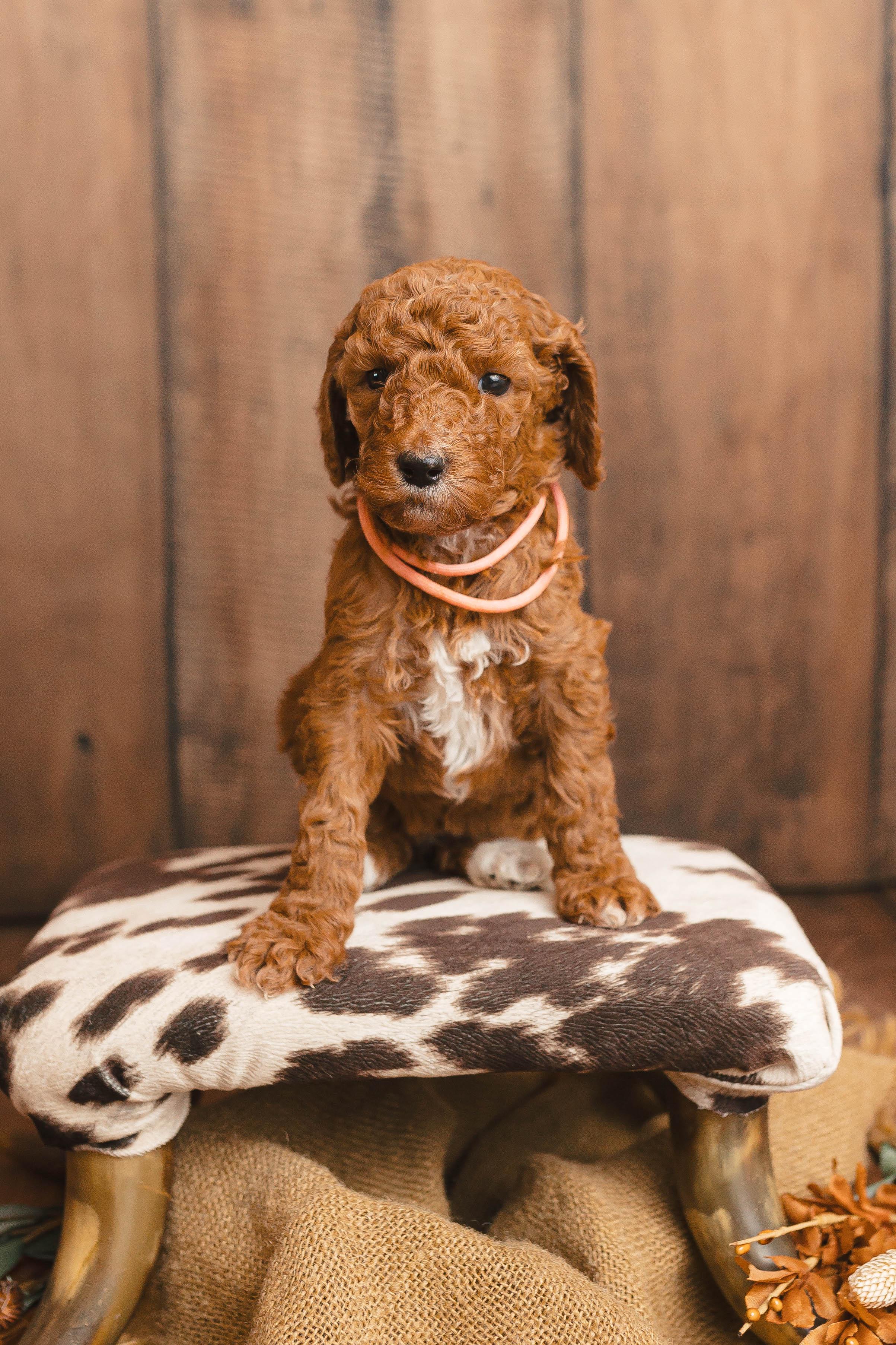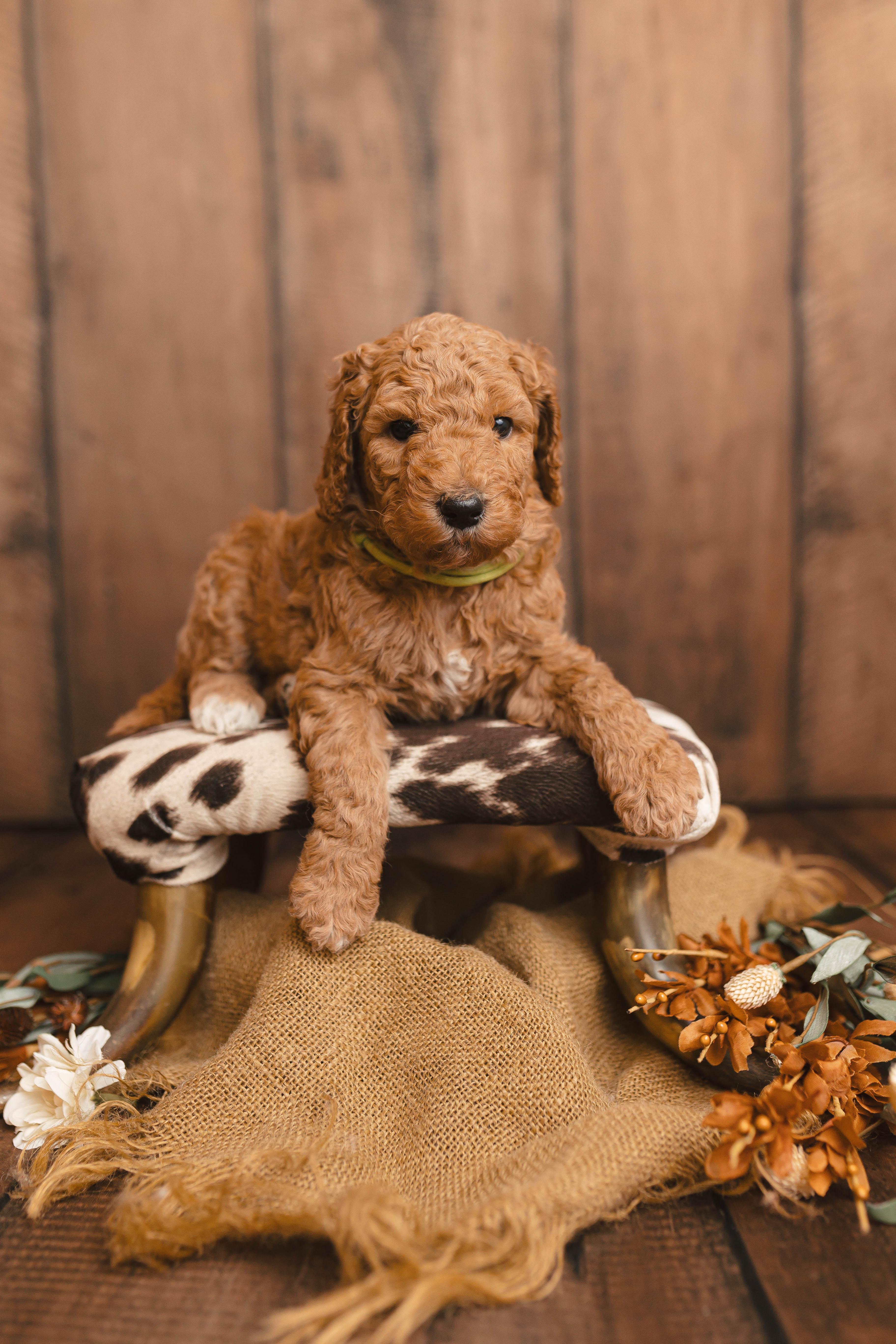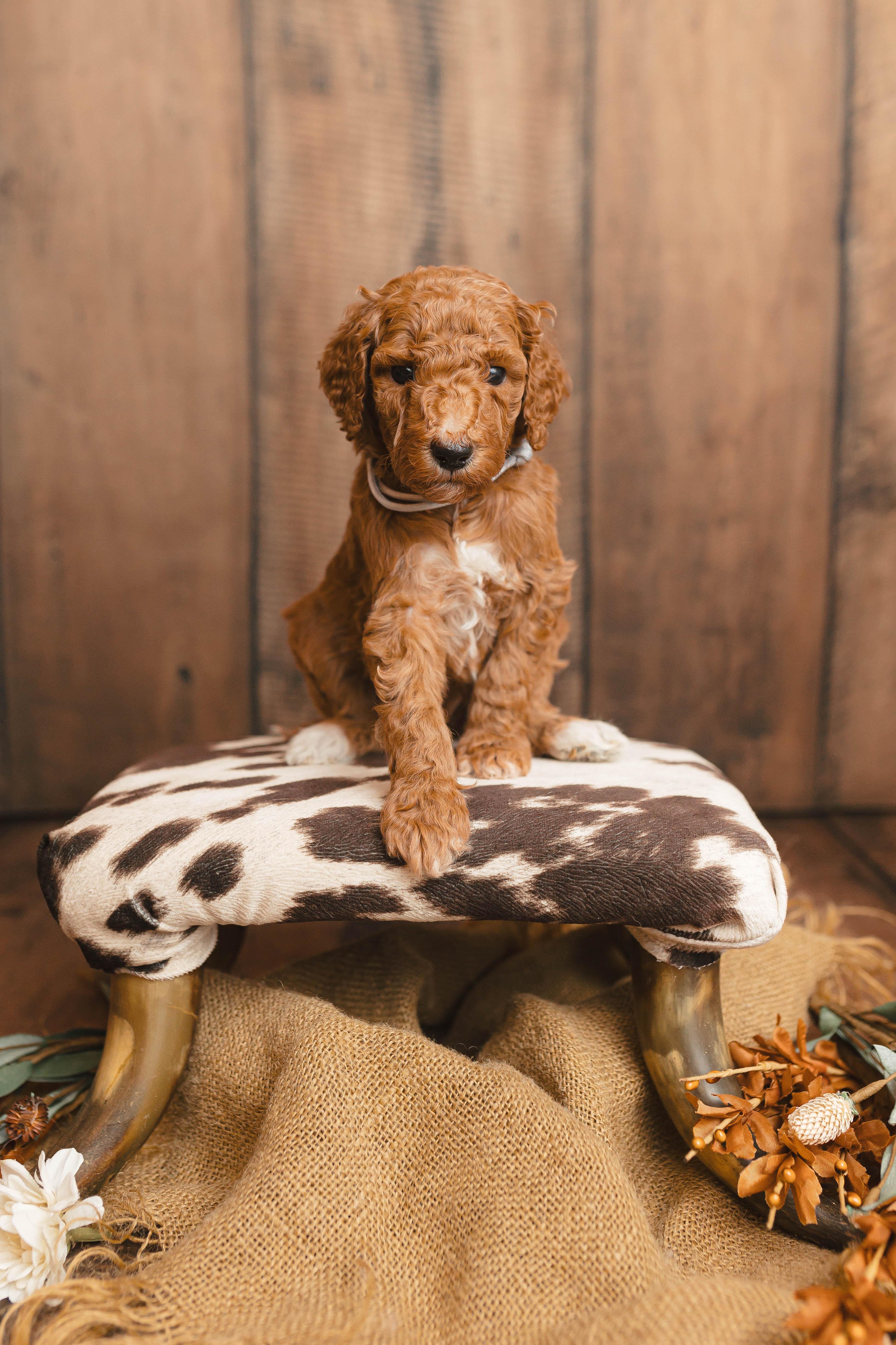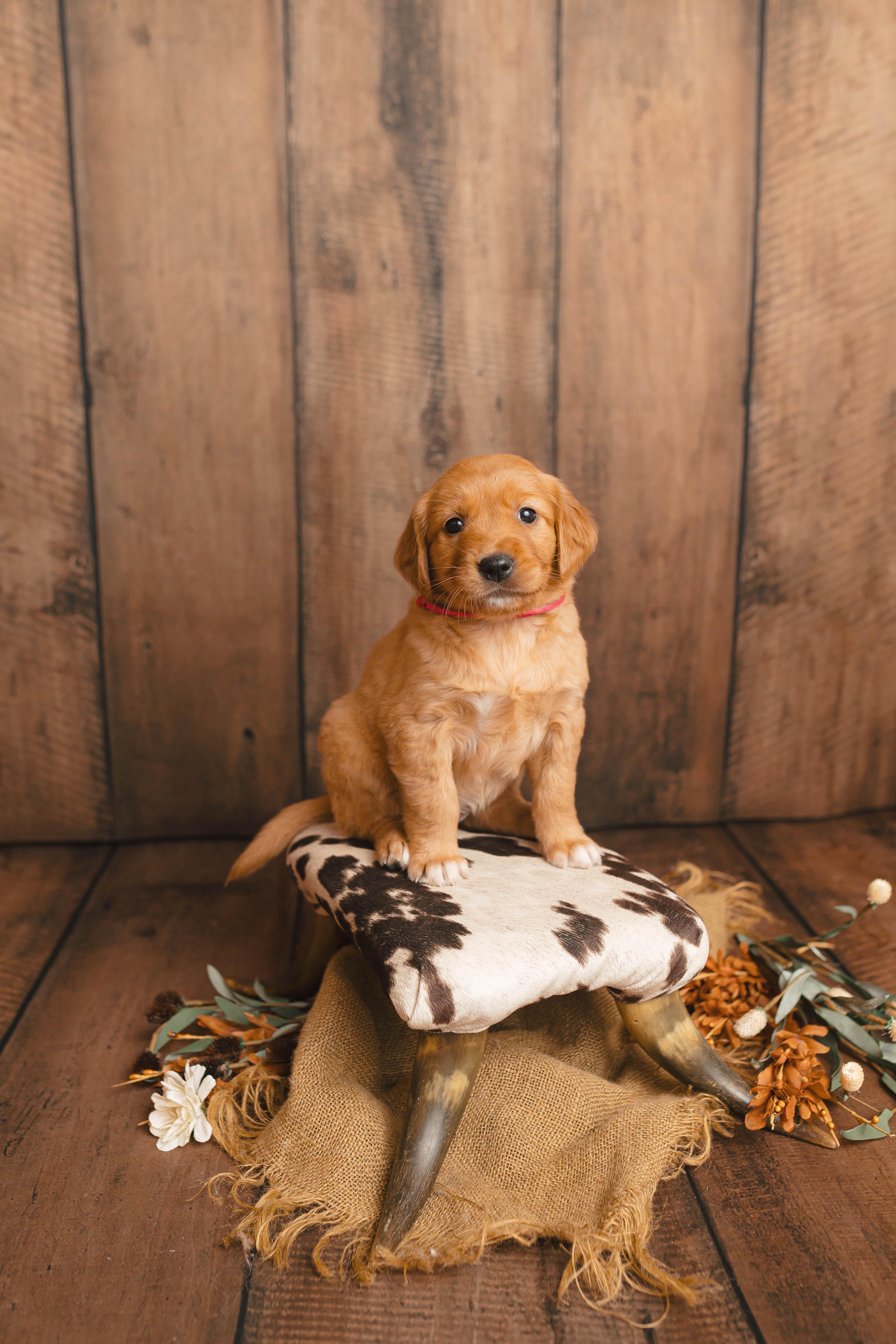 Our Golden Retriever puppies are dark golden. Poodle puppies include apricot and red. Colors will vary depending on the parent dogs.