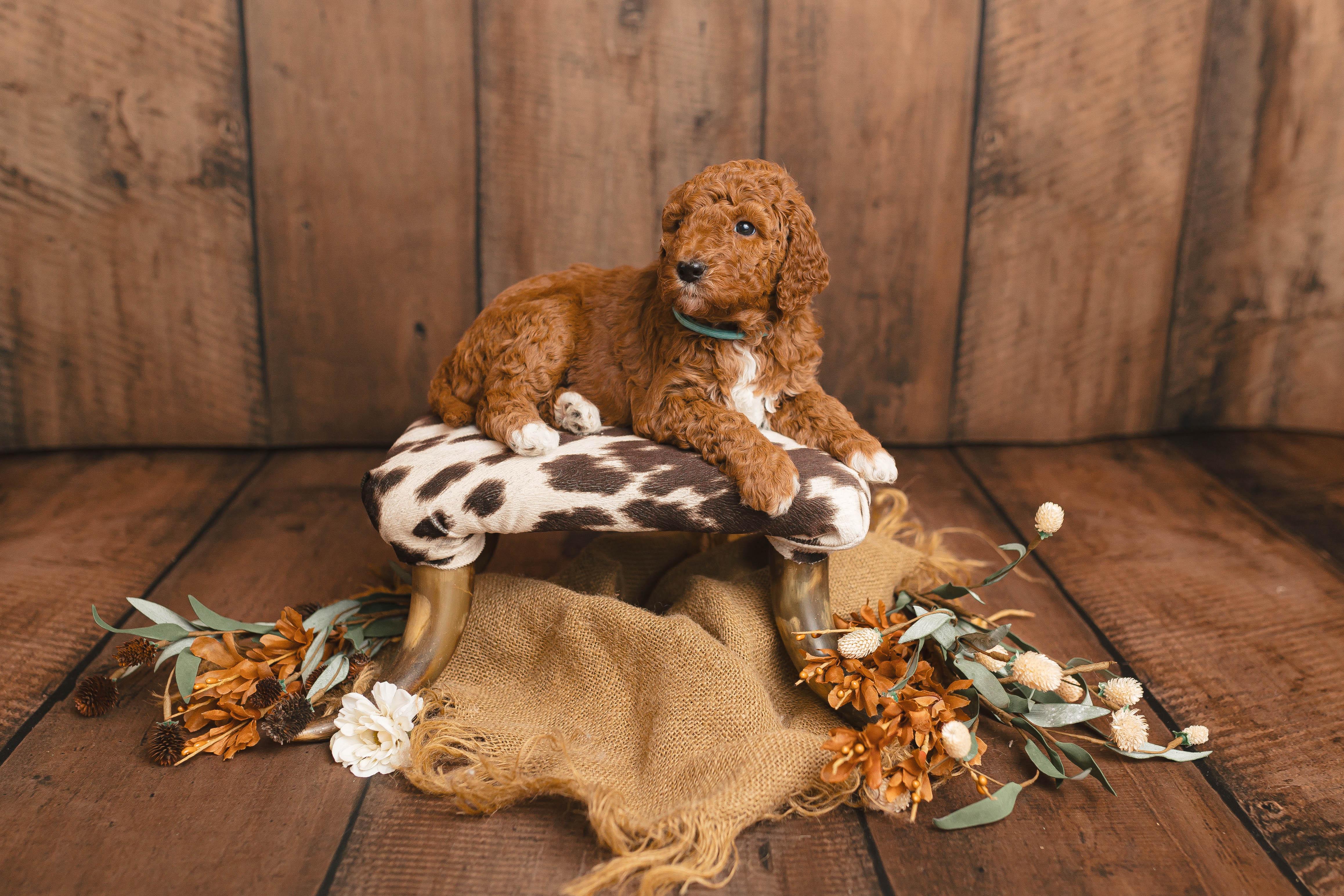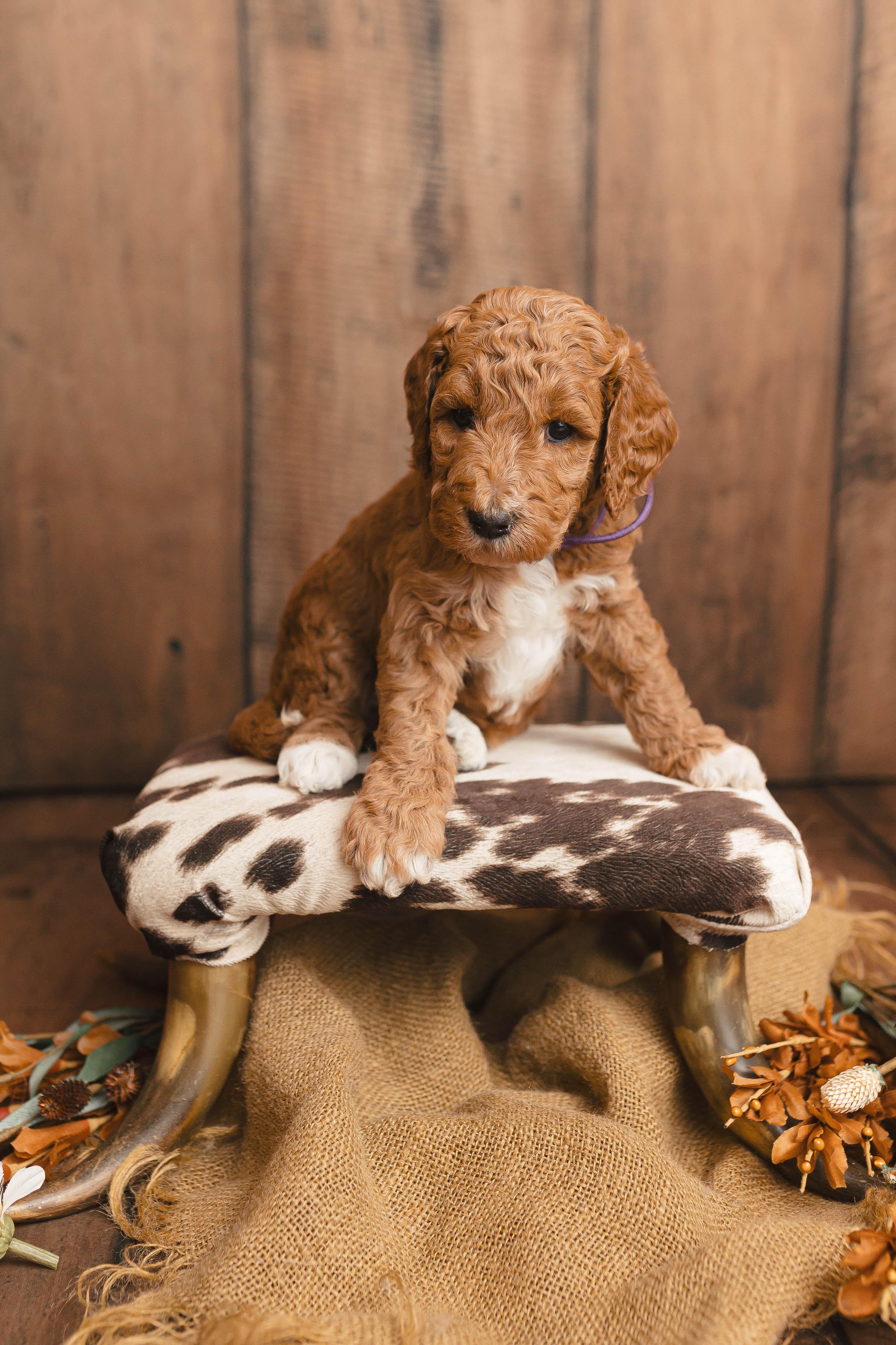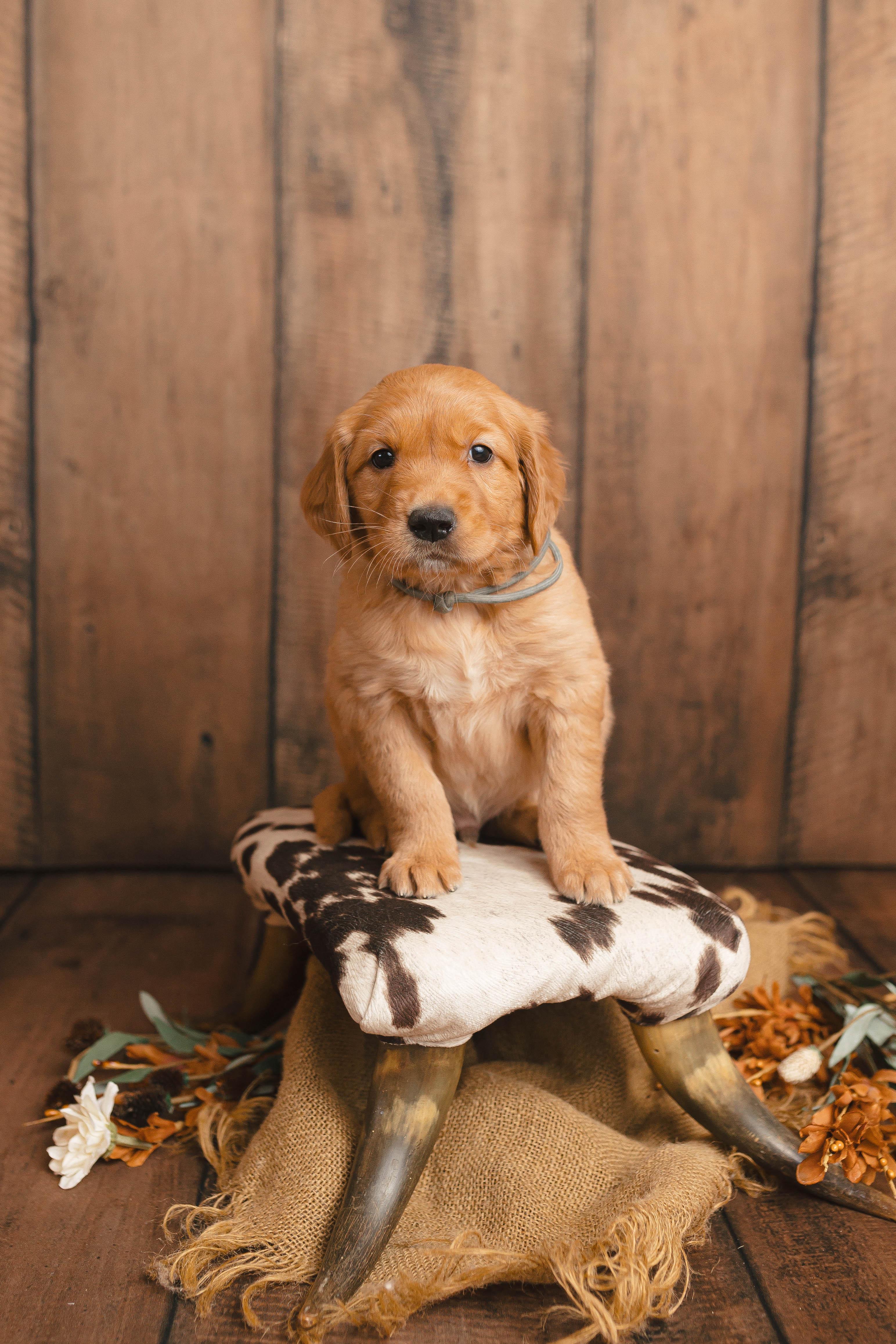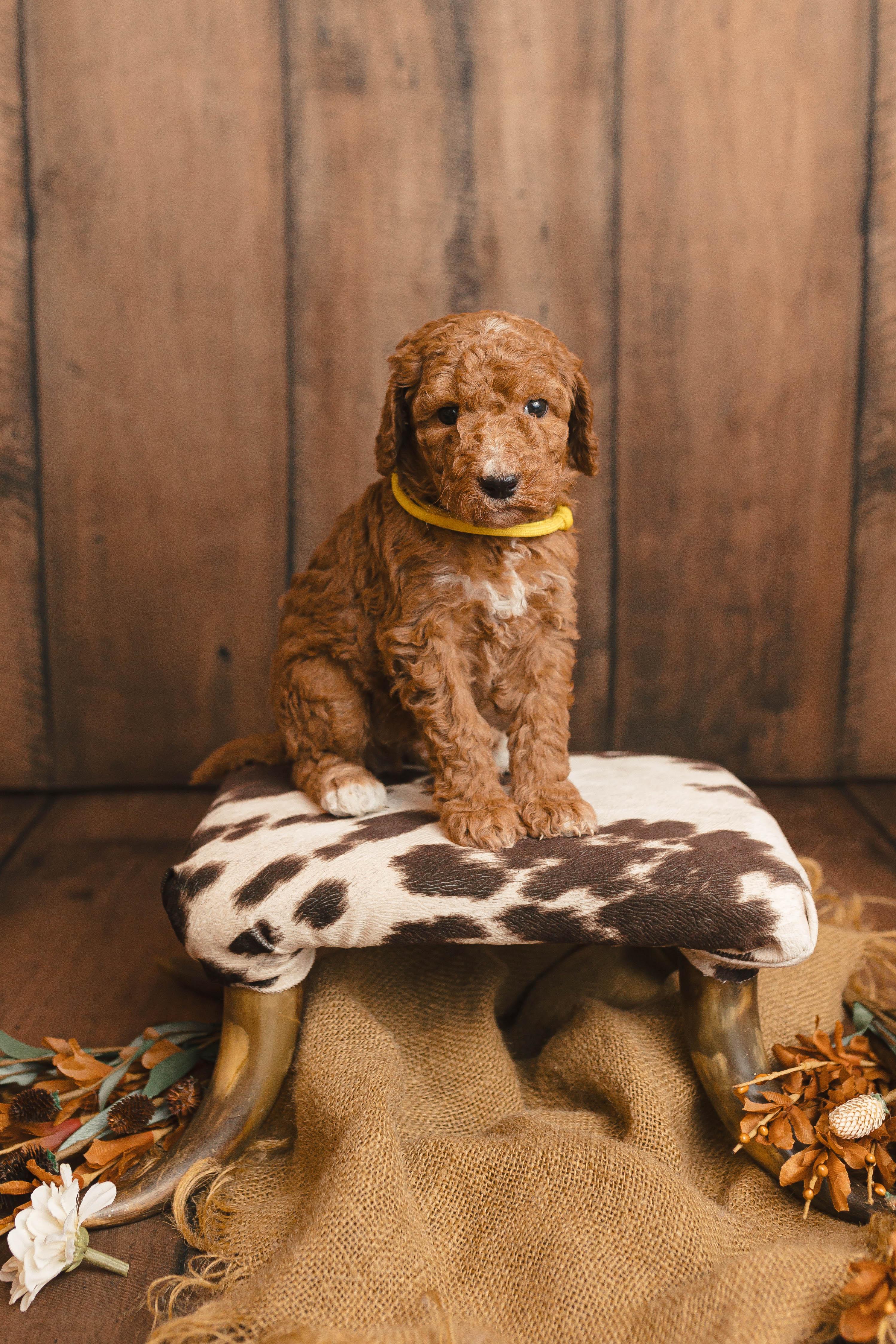 Our Golden Retriever puppies are dark golden. Poodle puppies include apricot and red. Colors will vary depending on the parent dogs.