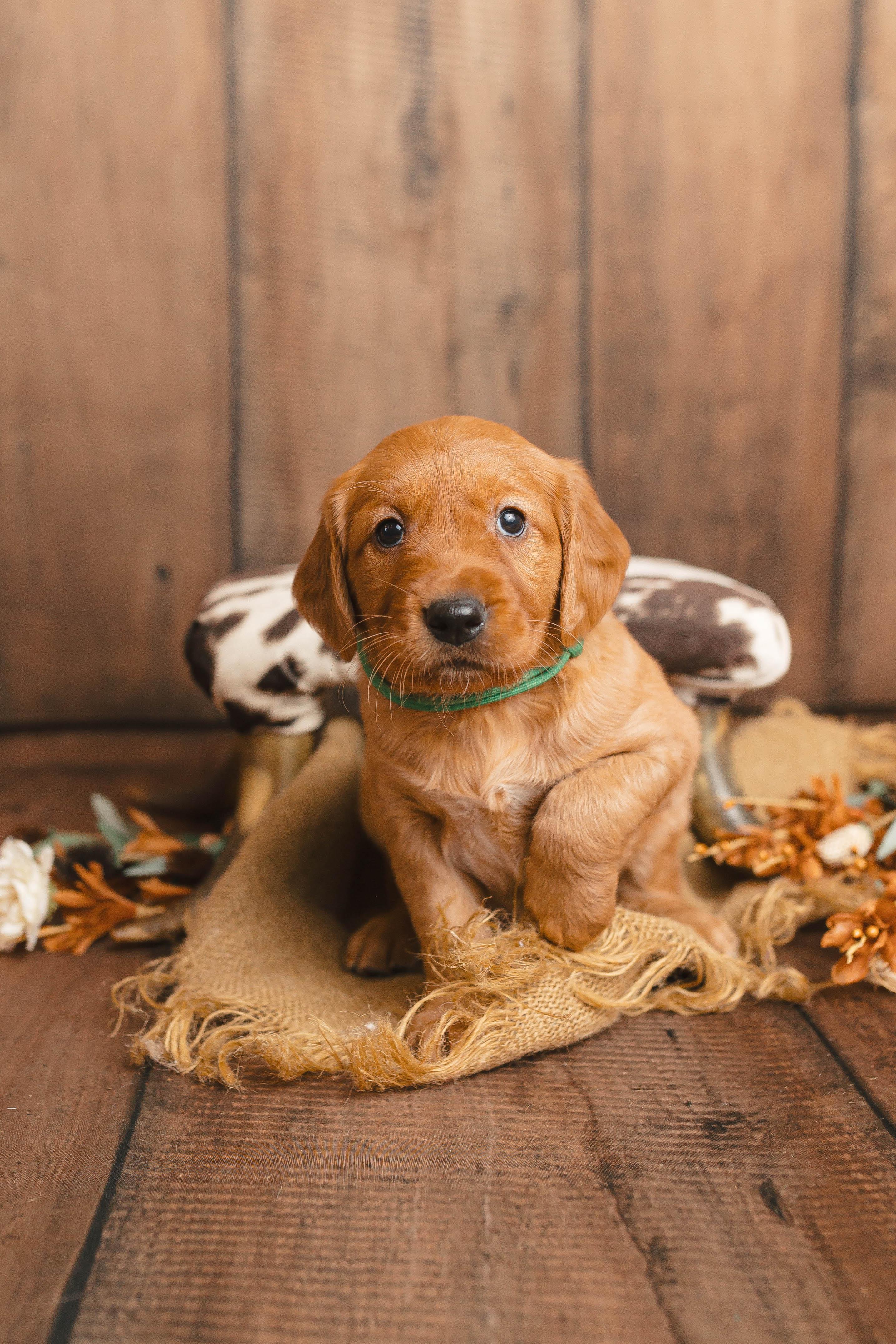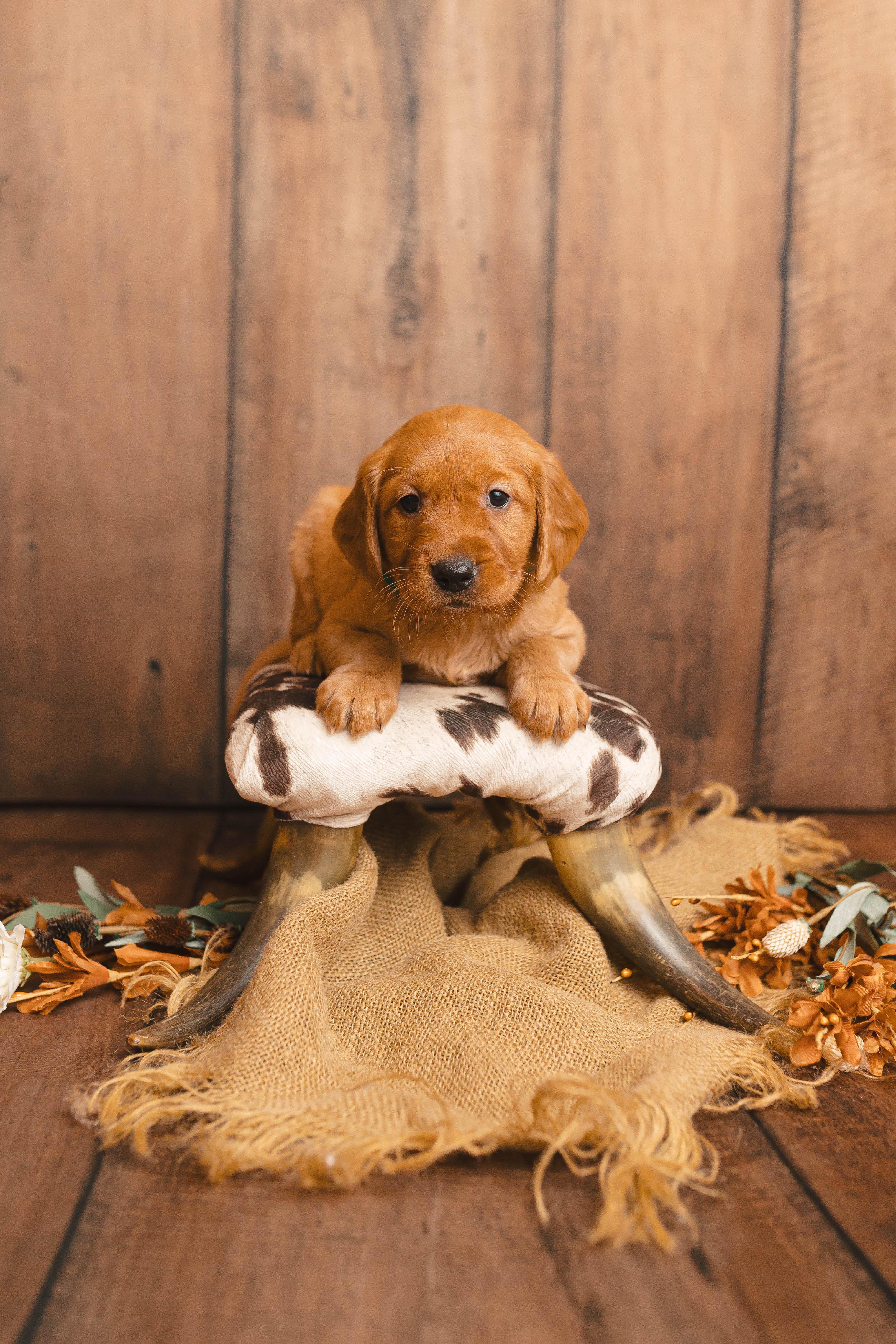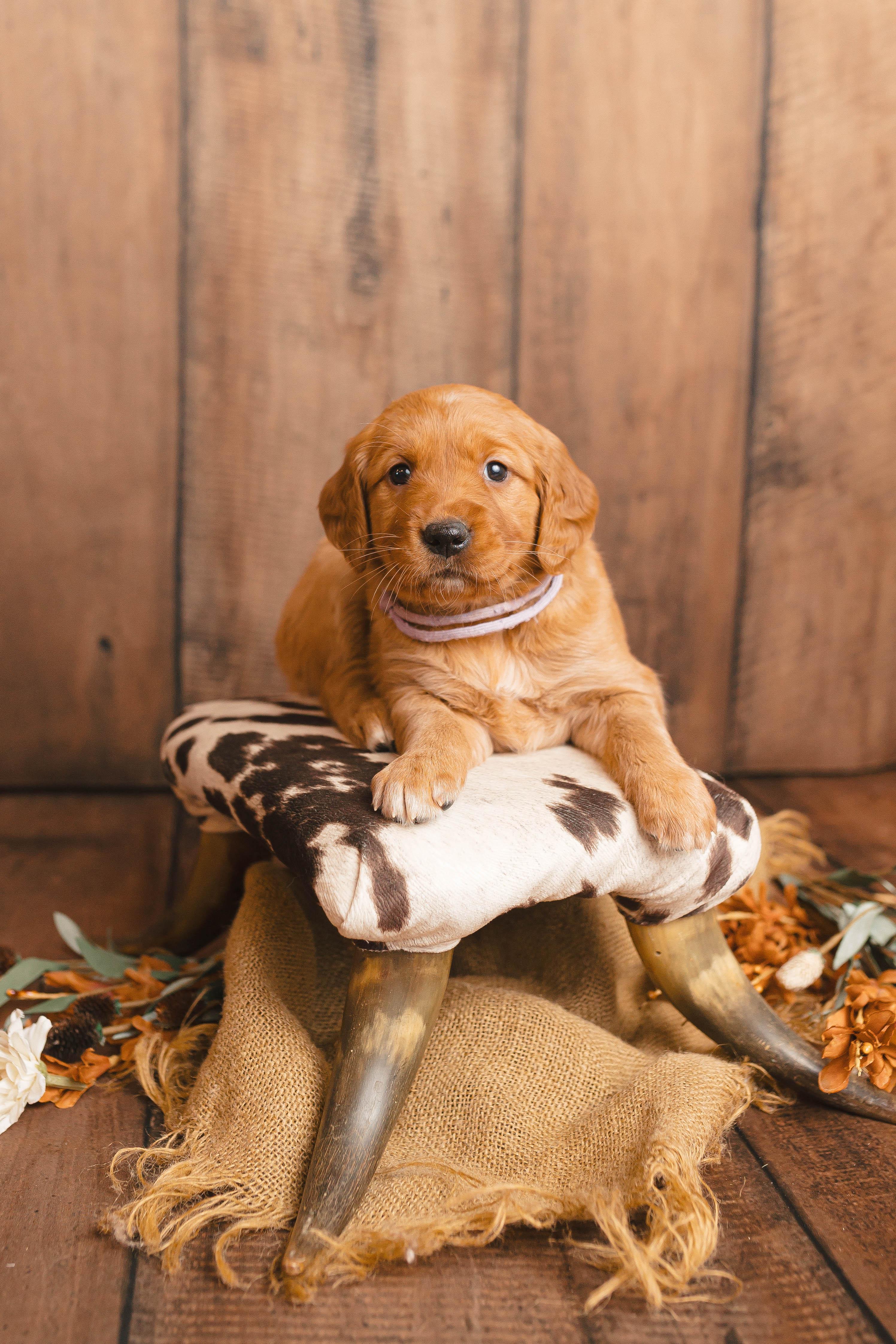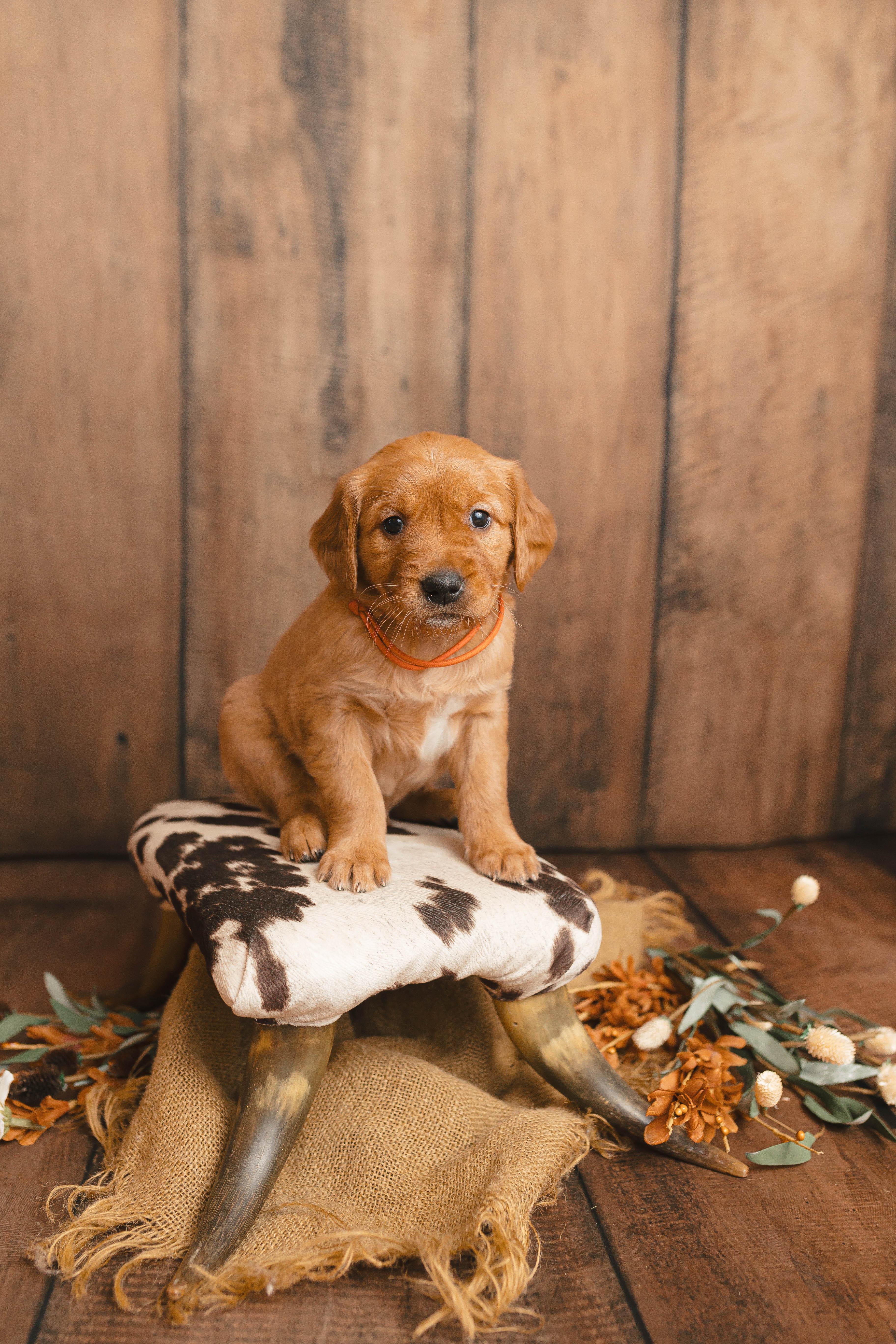 Our Golden Retriever puppies are dark golden. Poodle puppies include apricot and red. Colors will vary depending on the parent dogs.
