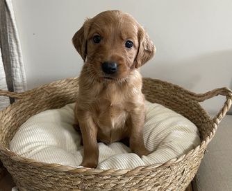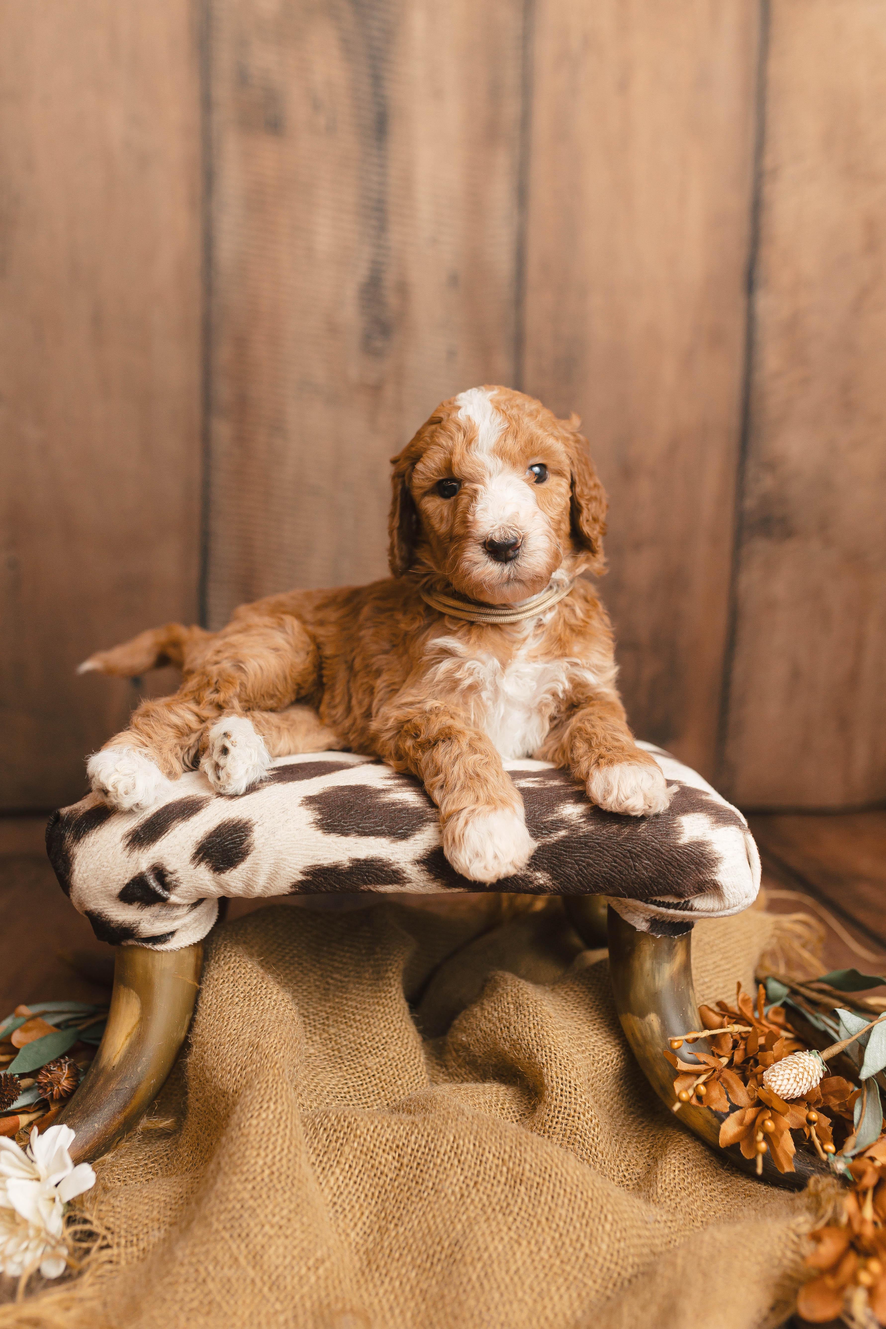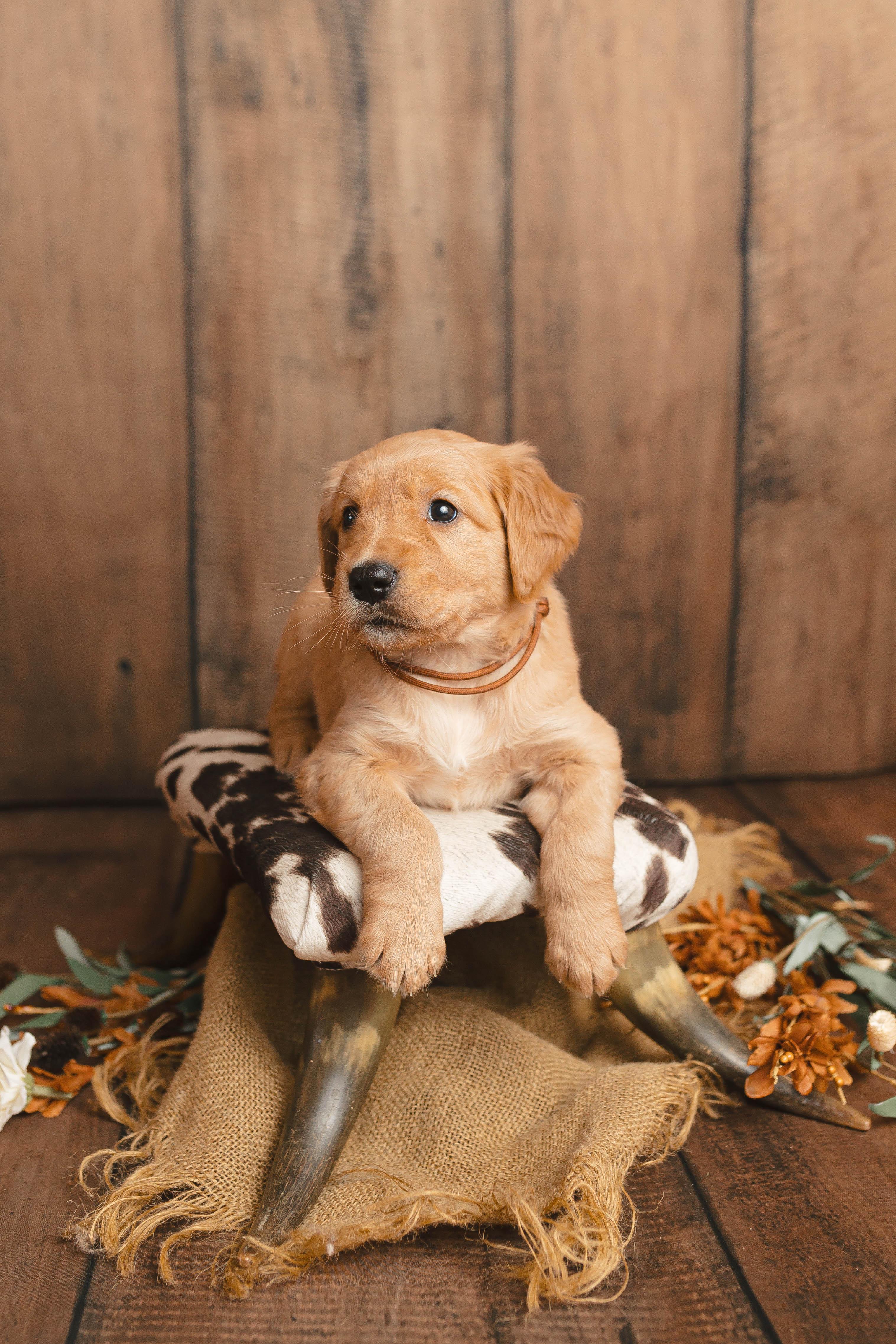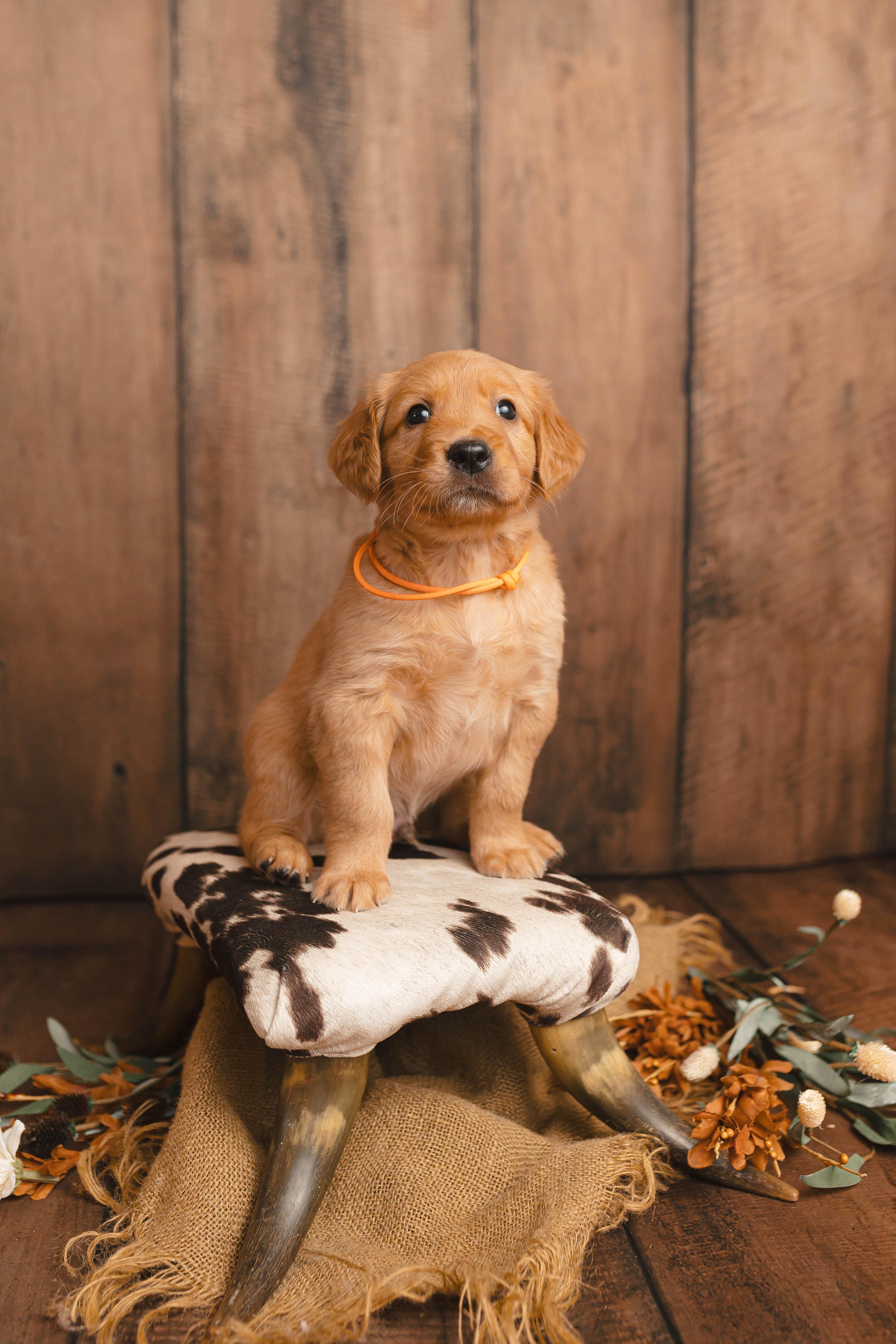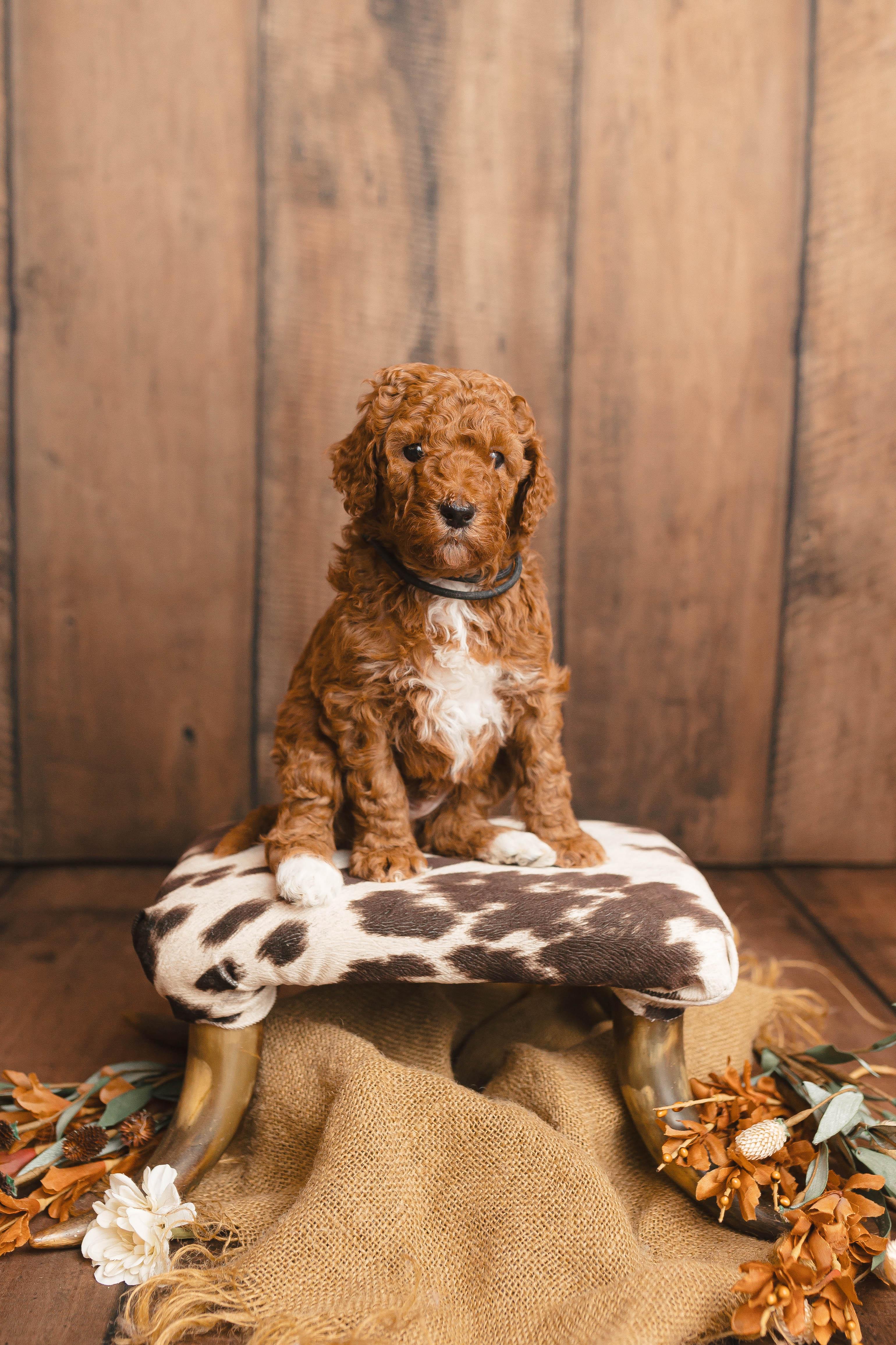 Our Golden Retriever puppies are dark golden. Poodle puppies include apricot and red. Colors will vary depending on the parent dogs.