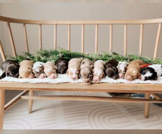 Our Goldendoodle puppies include cream, apricot, red, chocolate, merle, and parti. Australian Labradoodle puppies include caramel, caramel red, cream, chocolate, and tri-color. Colors will vary depending on the parent dogs.