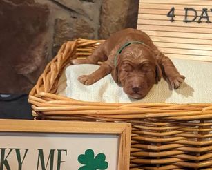 “The price includes a beautiful Irish golden doodle puppy, a puppy go home package (collar, blanket, food, toy), dewormer, first round of shots, and a microchip. Puppy will also be vet checked and very well socialized. Puppies are raised in our home and will be accustomed to a variety of household noises and activities. A non refundable deposit if $200 is required to reserve a puppy.”