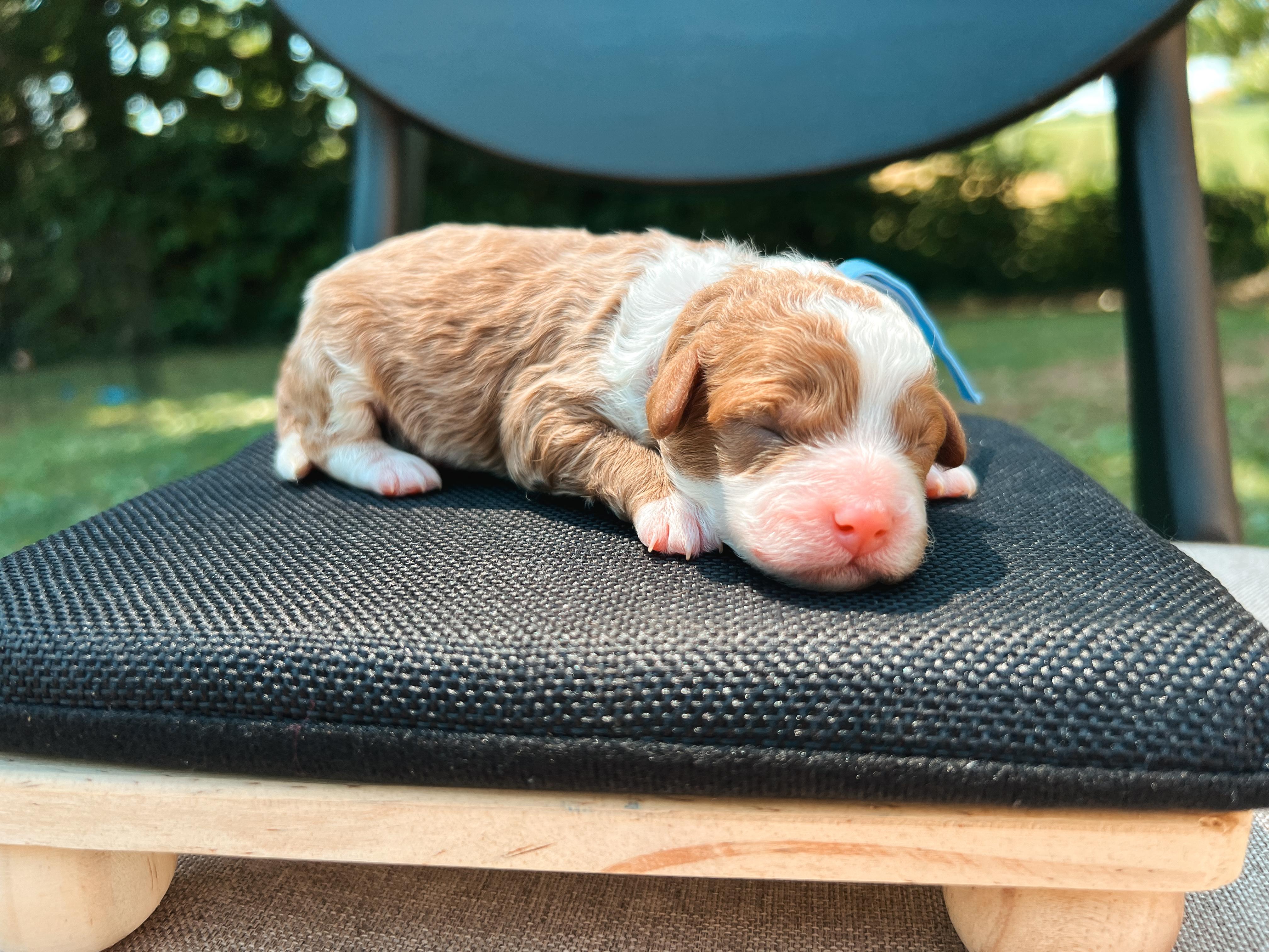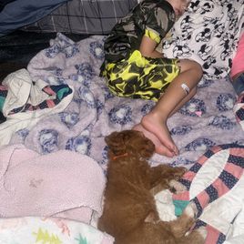 This boy is our last man standing and he is sooo sweet! Medium energy, very cuddly, high human focus! He is completely pad trained in an enclosed area and we’ve been transitioning outside. He’s been sleeping with his sisters and is transitioning to sleeping by himself now! He’s is sleeping from 10-5 currently! Message me to bring him home!