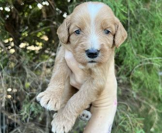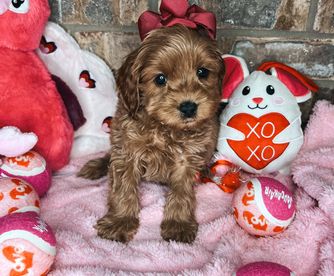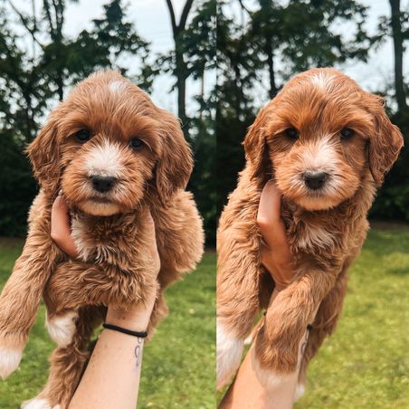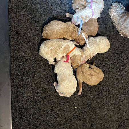 Our Cockapoo puppies include red and white and red. Goldendoodle puppies include apricot, red, and parti. Colors will vary depending on the parent dogs.