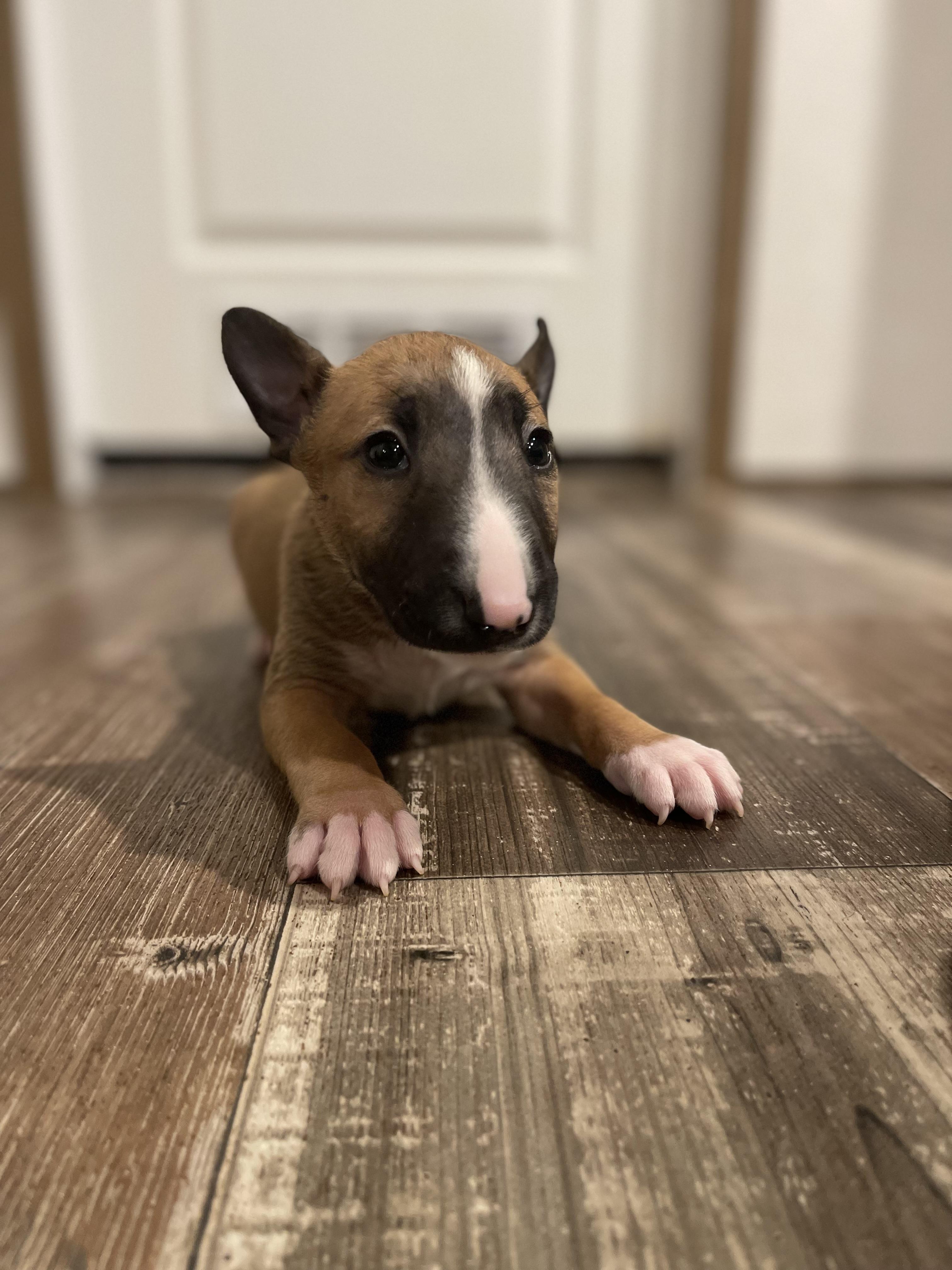 Our Bull Terrier puppies include white and black brindle, brindle, fawn, black tan and white, white black and tan, and black brindle and white. Poodle puppies include apricot, black, blue, cafe au lait, cream, red, white, parti, and phantom. Colors will vary depending on the parent dogs.
