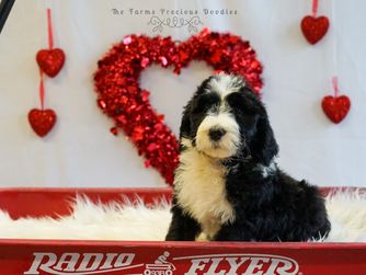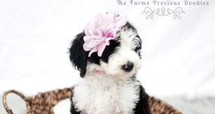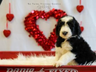 Our Sheepadoodle puppies are black and white. Colors will vary depending on the parent dogs.