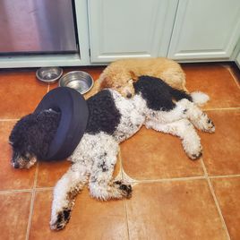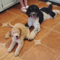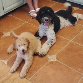 It was a pleasure working with Amy and Mike to add our new puppy "Belle" to our family. We kept her name and introduced her to our 7 month goldendoodle Snoopy. They immediately became best friends! You can tell that Belle was raised in a loving environment. She adapted amazingly to our household and had no issues whatsoever. She is gentle, loving and very playful. Her tail is constantly wagging! We drove from Florida to pick up Belle. Amy was so good about helping to find a good meeting place to help with some of the distance. I've included some pictures of Belle and Snoopy. One is of her consoling Snoopy after he was neutered! We are more than pleased with our experience dealing with The Golden Rule Doodles. Thanks again Amy! Curt and Pat Tellbuescher