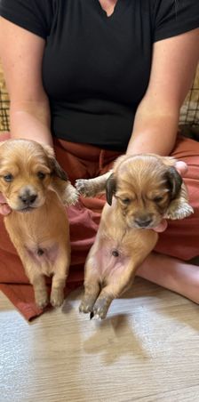 Our puppies include cream, red, chocolate and tan, chocolate and cream, black and tan, black and cream, and dapple. Colors will vary depending on the parent dogs.