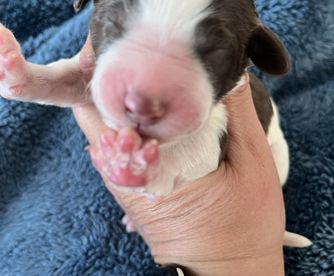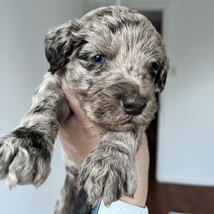 “We do ENS training on puppy and introduce potty and crate training. Our pups are vet checked dewormed and have first parvo/distemper vaccine. Our puppies price depends on color and coat. They range from phantom, tri-color, parti, and Merle.”