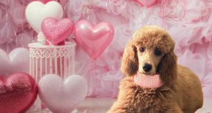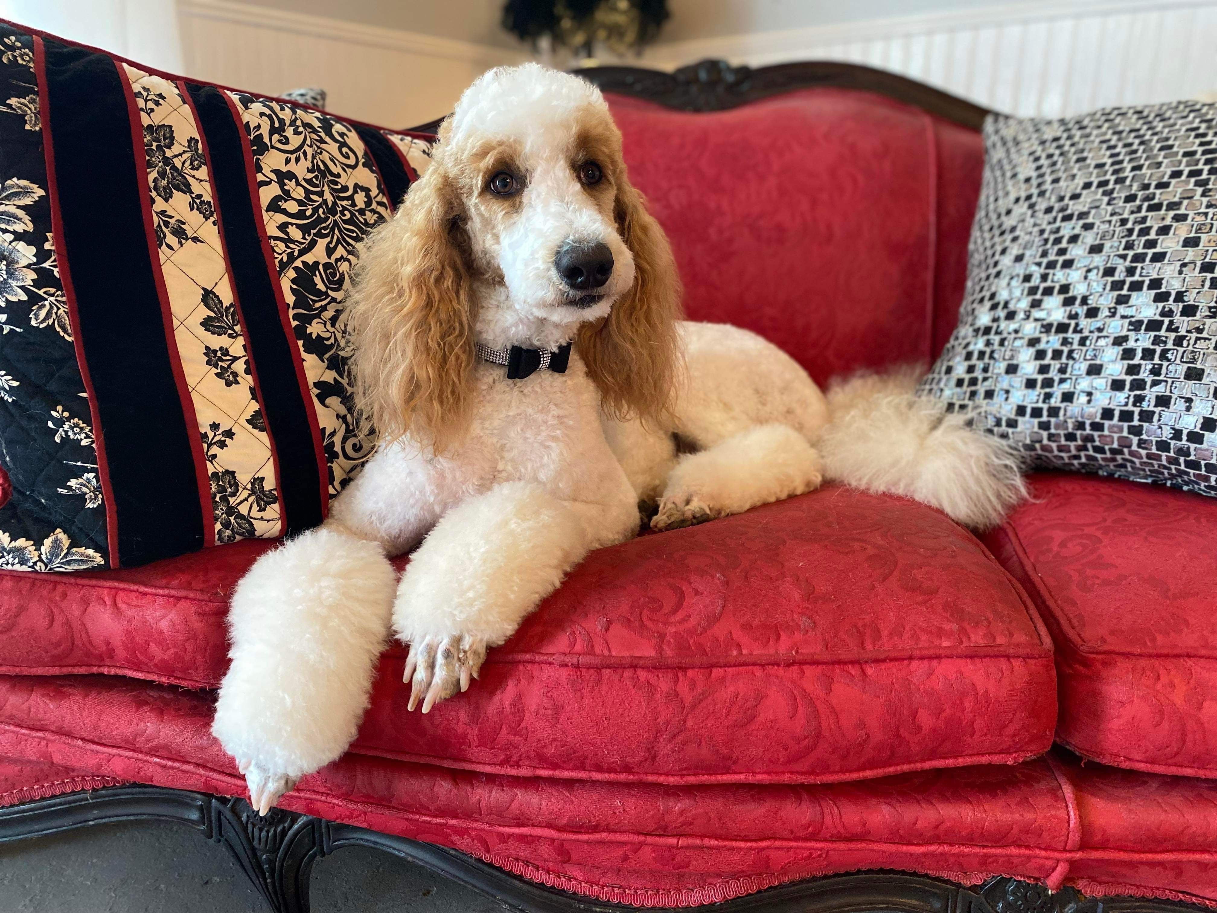 Tessa is the most loving standard poodle, red and white parti with curly coat. Very smart and an excellent mom! She resides in my home with her fur sisters!