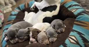Our puppies include blue and white, lemon and white, sable and white, red and white, chocolate and white, blue fawn and white, and black and white. Colors will vary depending on the parent dogs.