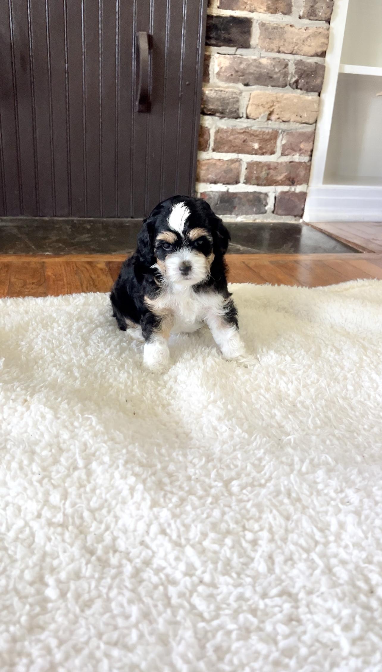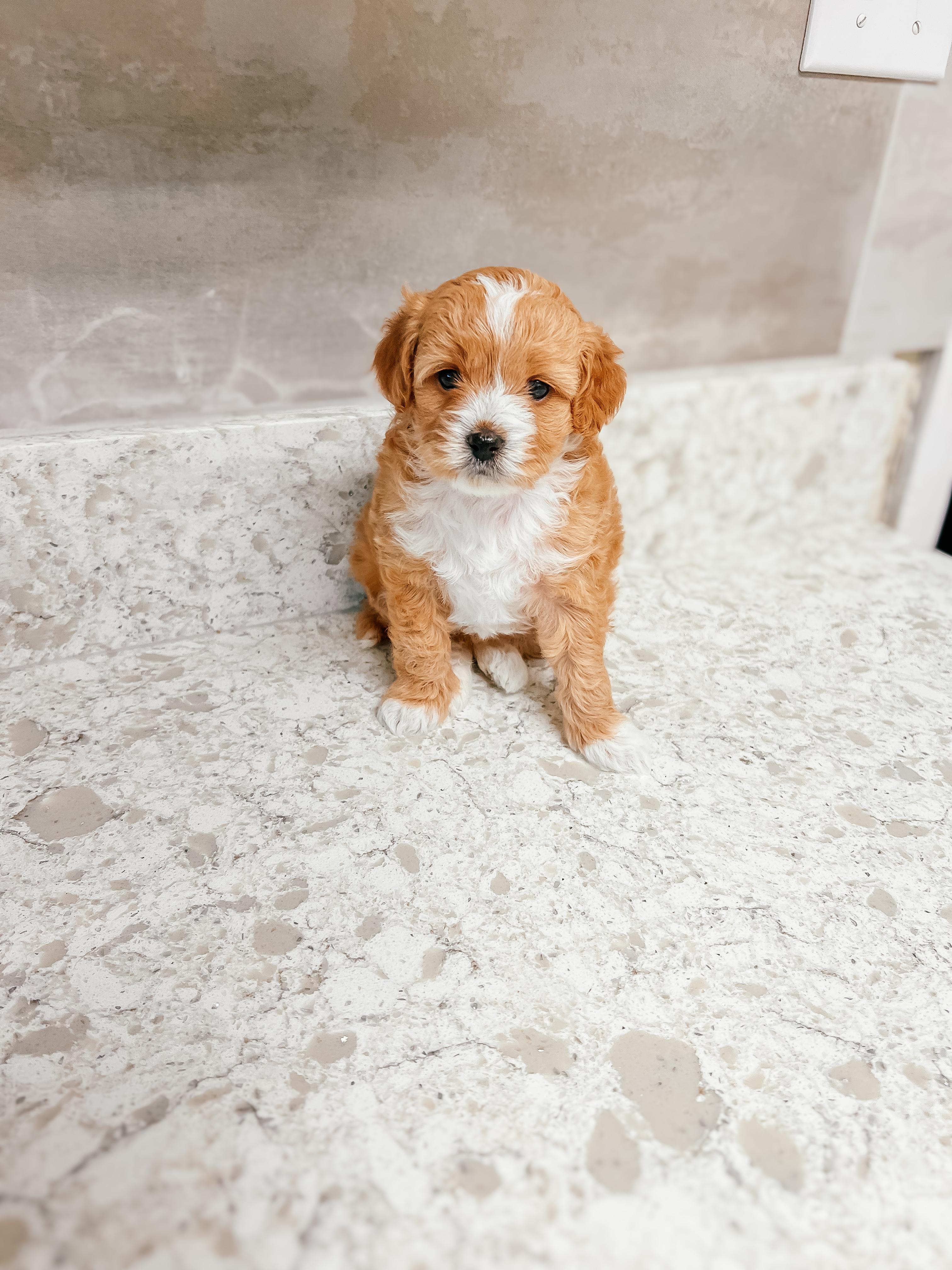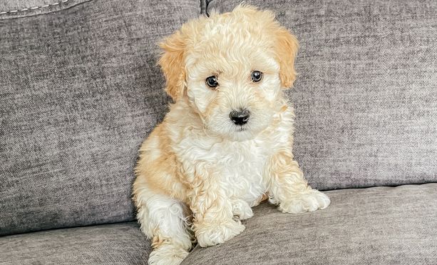 Our Bichon Frise puppies are white and apricot. Cockapoo puppies include merle, buff and white, cream, red and white, red, sable, black and white, black and tan, and black white and tan. Colors will vary depending on the parent dogs.