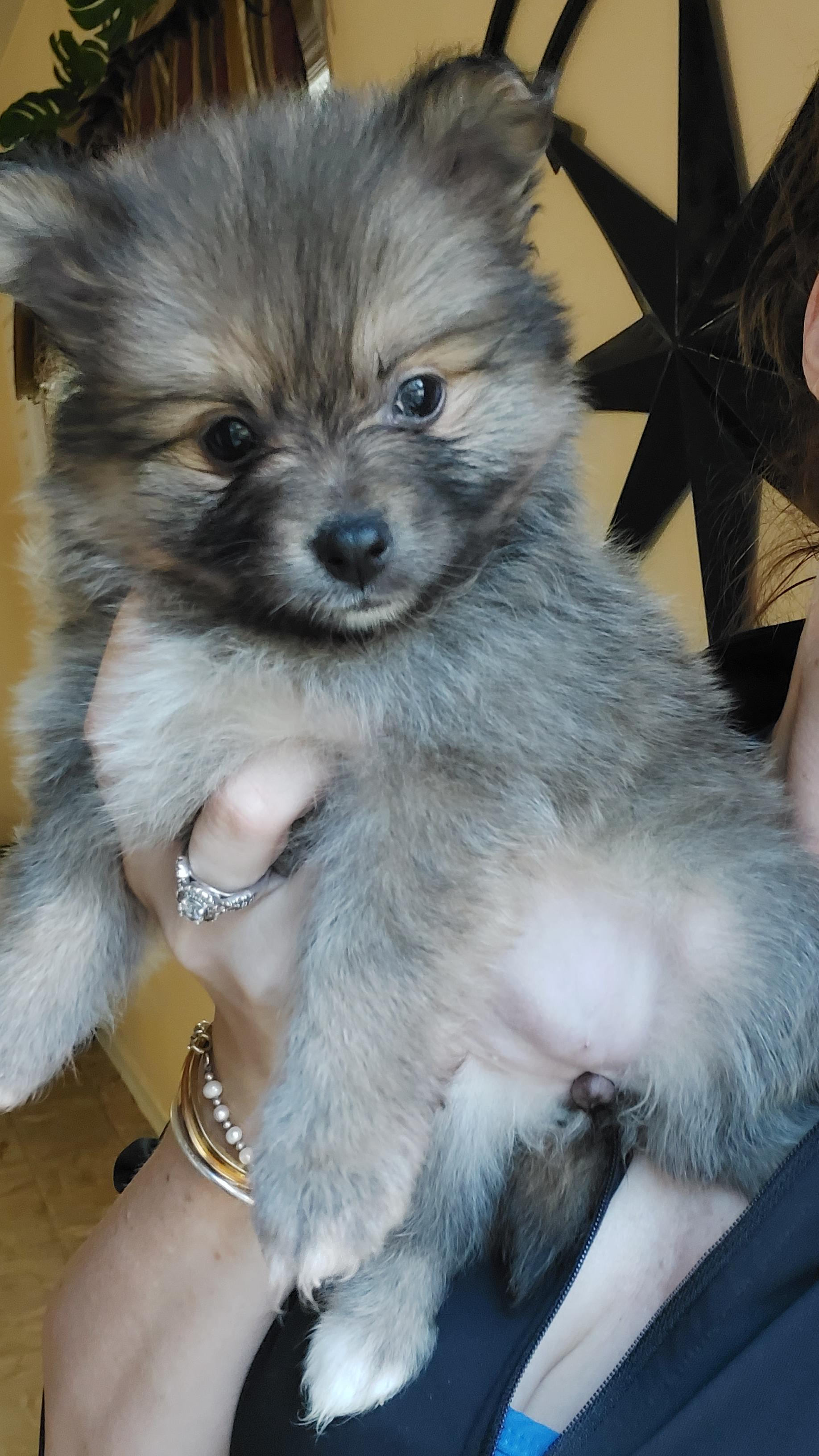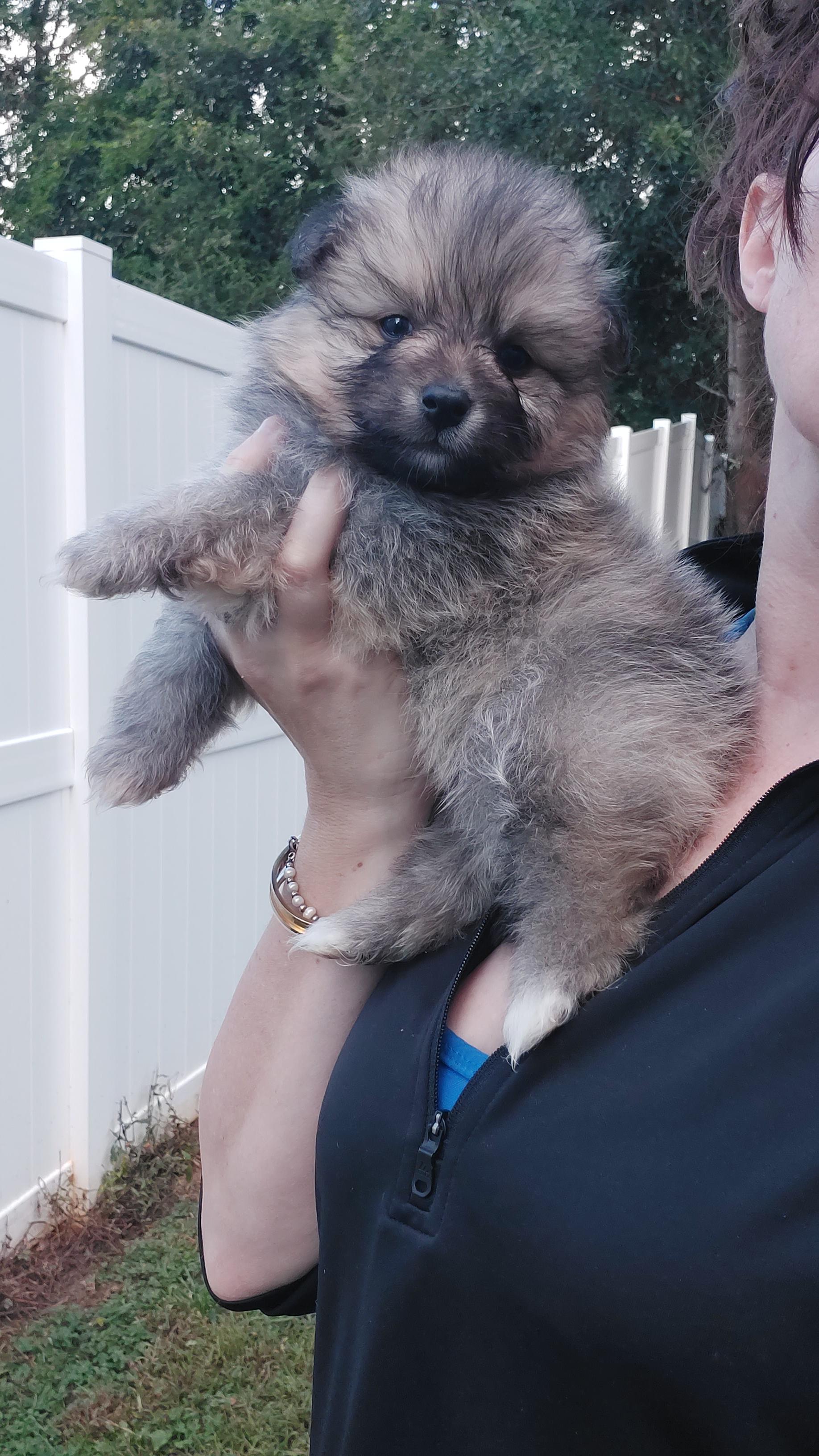Our Pomeranian puppies include cream, black, blue and tan, and black and tan. Pomsky puppies include tri-color and black and white. Colors will vary depending on the parent dogs.