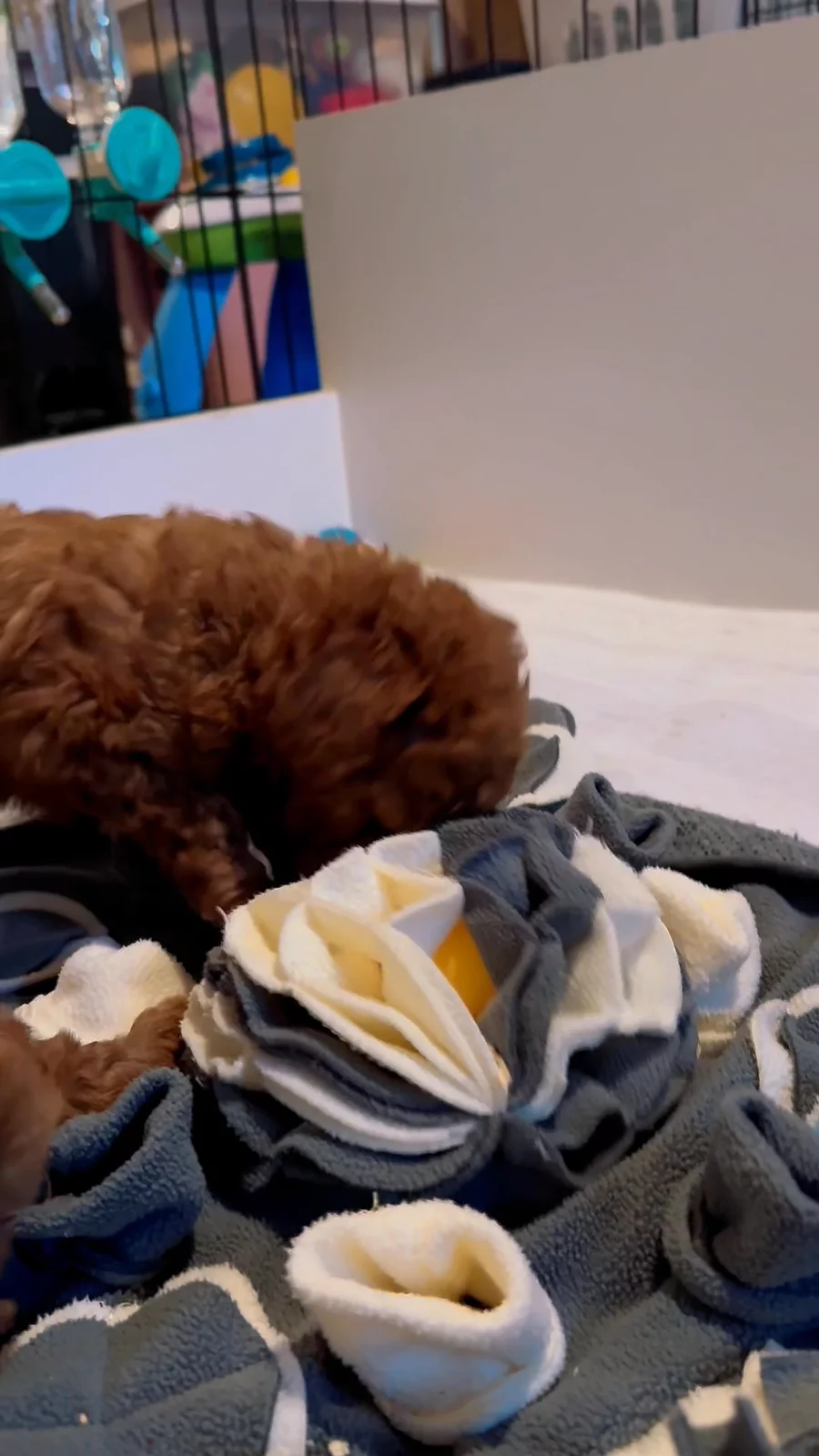 Early Puppy Socialization at its cutest! 🐾 Today’s lesson: how to use your nose to find hidden treasures. 🦴 The snuffle mat keeps their minds active and their bellies happy!