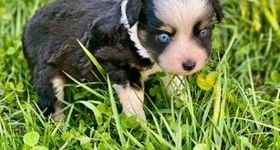 Our Aussies are extra small and have been raised around all kinds of other animals and really small people. Both Mom and Dad have double Blue Eyes.
