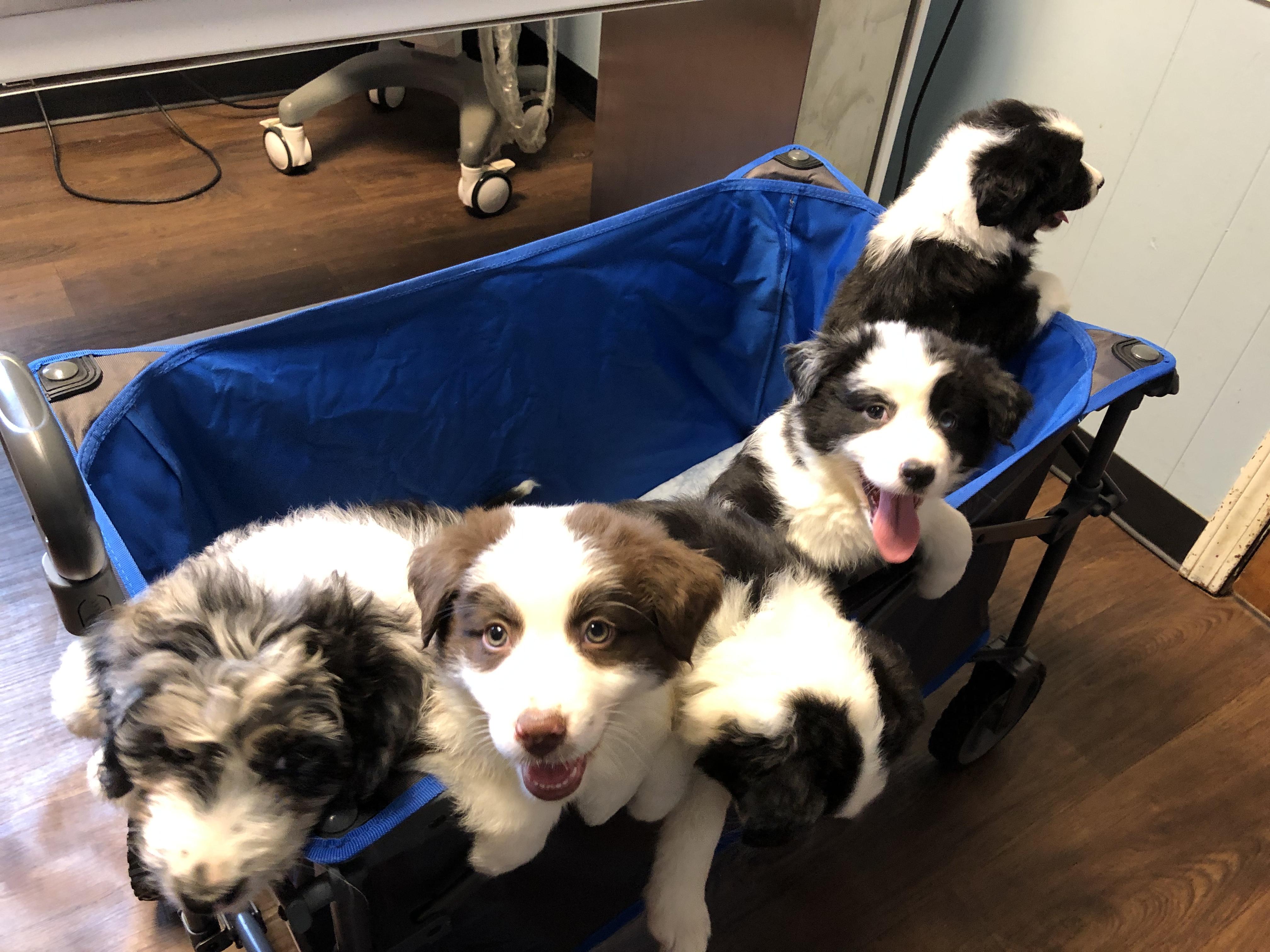 Our puppies include black, red merle, blue merle, and red. Colors will vary depending on the parent dogs.
