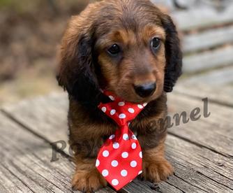Dachshund puppies have longhaired coats. Coat types may vary depending on the parent dogs.