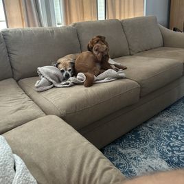 I reached out to The Sharpeagle Bakery after my beloved Sharpeagle, Leo crossed over the Rainbow Bridge. It was devastating for all of us, especially my older dog, Renzo. Nancy had two litters of Sharpeagles available, and I couldn't believe it. Working with Nancy was such a great experience. She was attentive and answered all questions promptly. She has an very thorough and necessary screening process to ensure her pups' forever homes are a good match. I finally decided to adopt Hugo, who was about 10 months old. We ran into issues with delivery, since Hugo was a little too big to fly, and his breed mix was apparently not allowed in cargo. Nancy worked literally day and night to find ground transport for Hugo, and honestly, I think ground transport is better than flying. Also, Nancy takes really great care of her pups. Hugo came with an extensive medical record, which included his genetic profile, which showed what he would be possible susceptible to medically. My vet was very impressed by the packet Hugo came with. Hugo was a great fit for our family, and we are all thrilled that we deserved to be his forever home. He's so sweet and kind, and he loves to play with his elder brother Renzo. Nancy is wonderful, and genuinely kind. I'm happy to have met her and make a new friend. We communicate still, and who knows, I can't get enough of the wrinkly Sharpeagles, I may need another! I highly recommend The Sharpeagle Barkery. Sharpeagles are so cuddly and loyal.