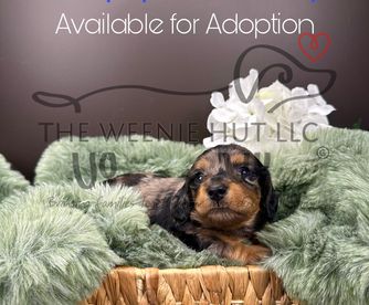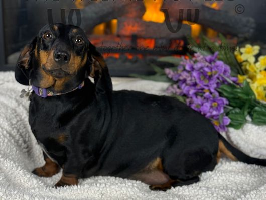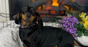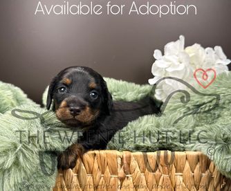 Mae is our very traditional black and tan smooth coat miniature dachshund. She weighs 14 lbs fully grown and loves eating…shoes preferably. Mae is AKC registered and is an amazing mom!