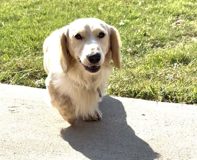 Earl Grey is gentle natured at heart and a love bug galore. He is 12 pounds and registered as a long-haired miniature dachshund piebald. His eyes are a mix of hazel and green. He enjoys playing tag in the yard with our other minis and naps with his person.