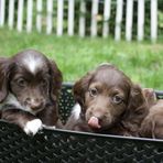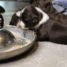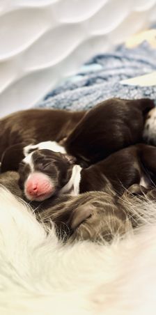 Our puppies include piebald and chocolate. Colors will vary depending on the parent dogs.