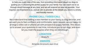 “Each puppy comes with a CKC registration, vet check, first set of vaccines, deworming, health guarantee, starter kit, and lifetime breeder support. Will be subtracted from the final total. The deposit is non-refundable if you later do not want the puppy. They will only be refundable if something happens to the dog during my care.”