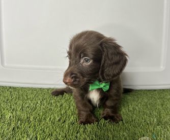 Atlas! The heartthrob of the house loving and goofy. He won first place for Best Dachshund at the West Coast Bullies and Frenchie EXPO, the first event in Puerto Rico to include the dachshund breed, and we proudly took home first place. His mom is a solid chocolate (FCI), and his dad is an Isabella and tan (AKC).