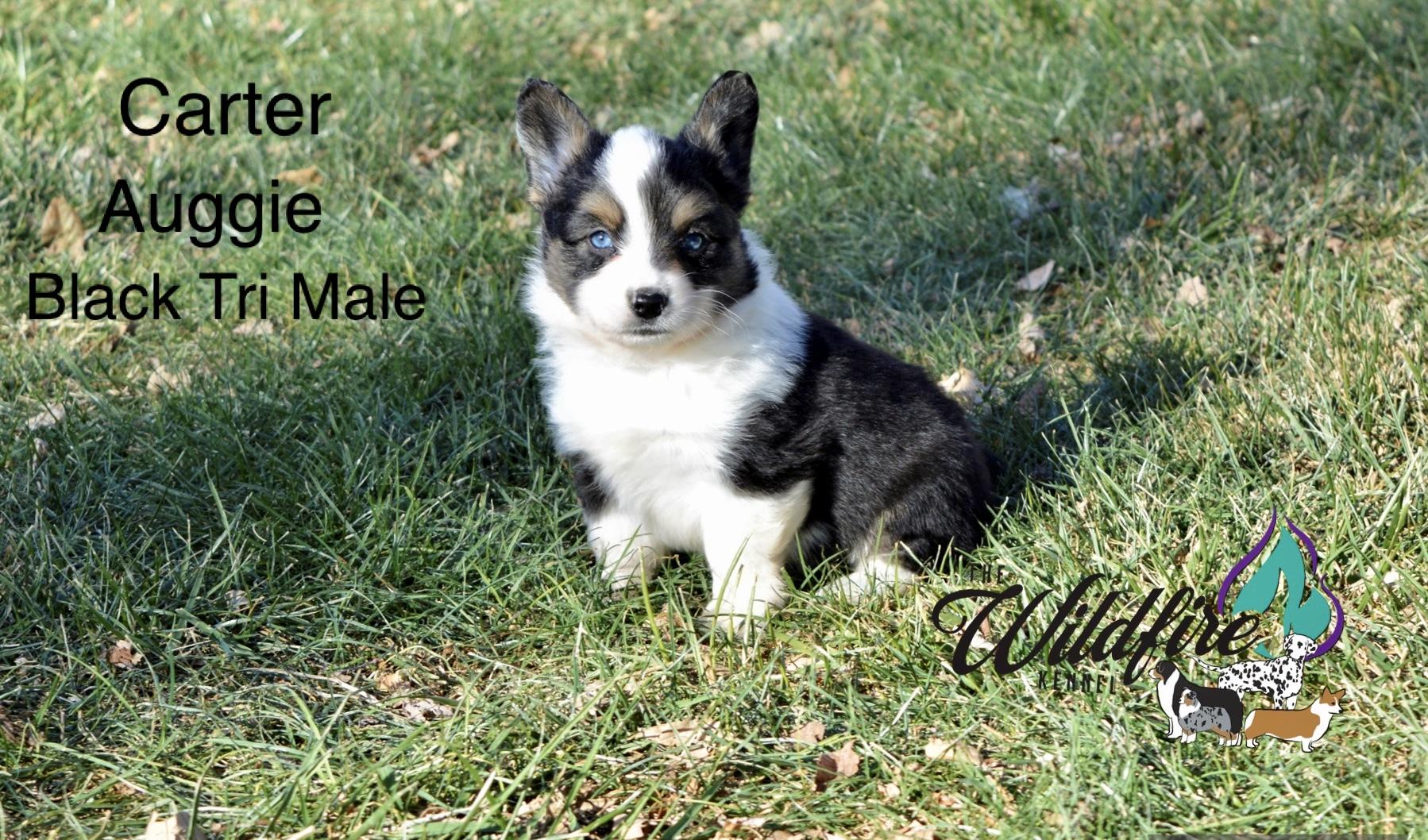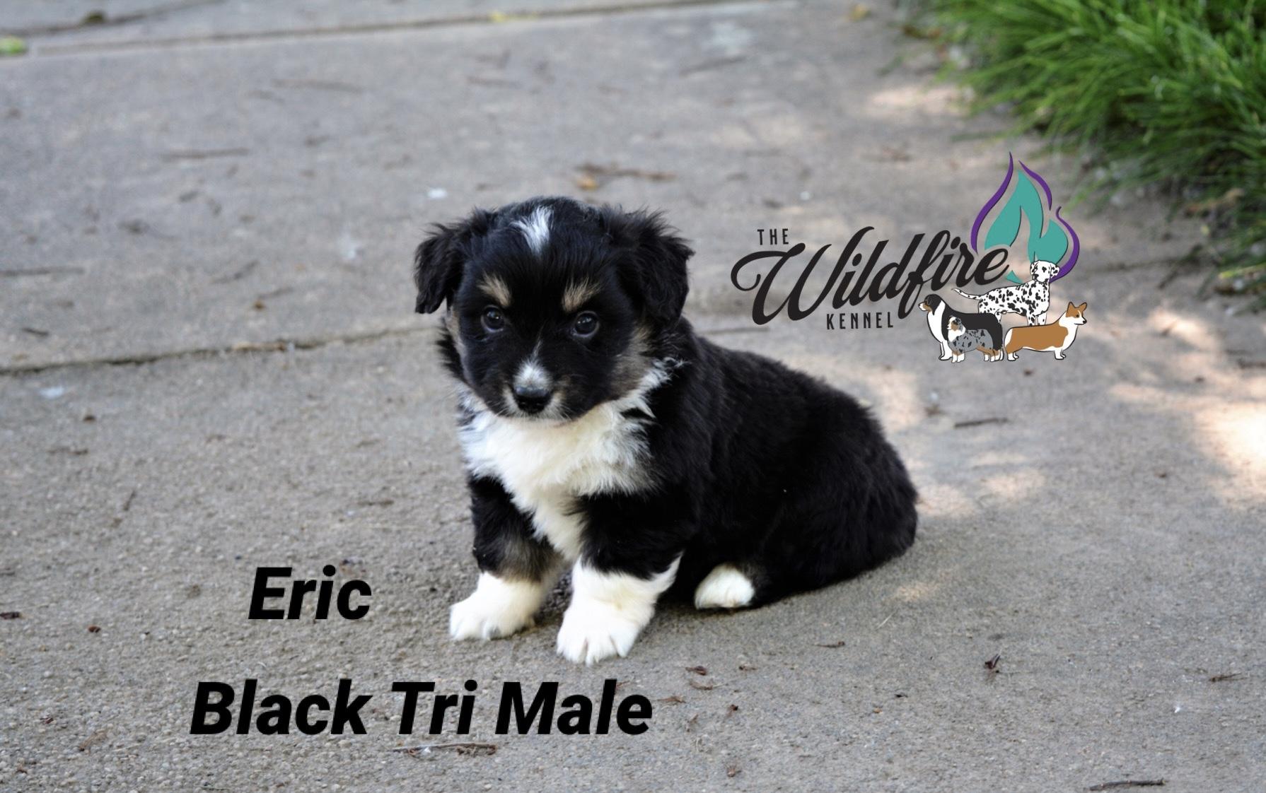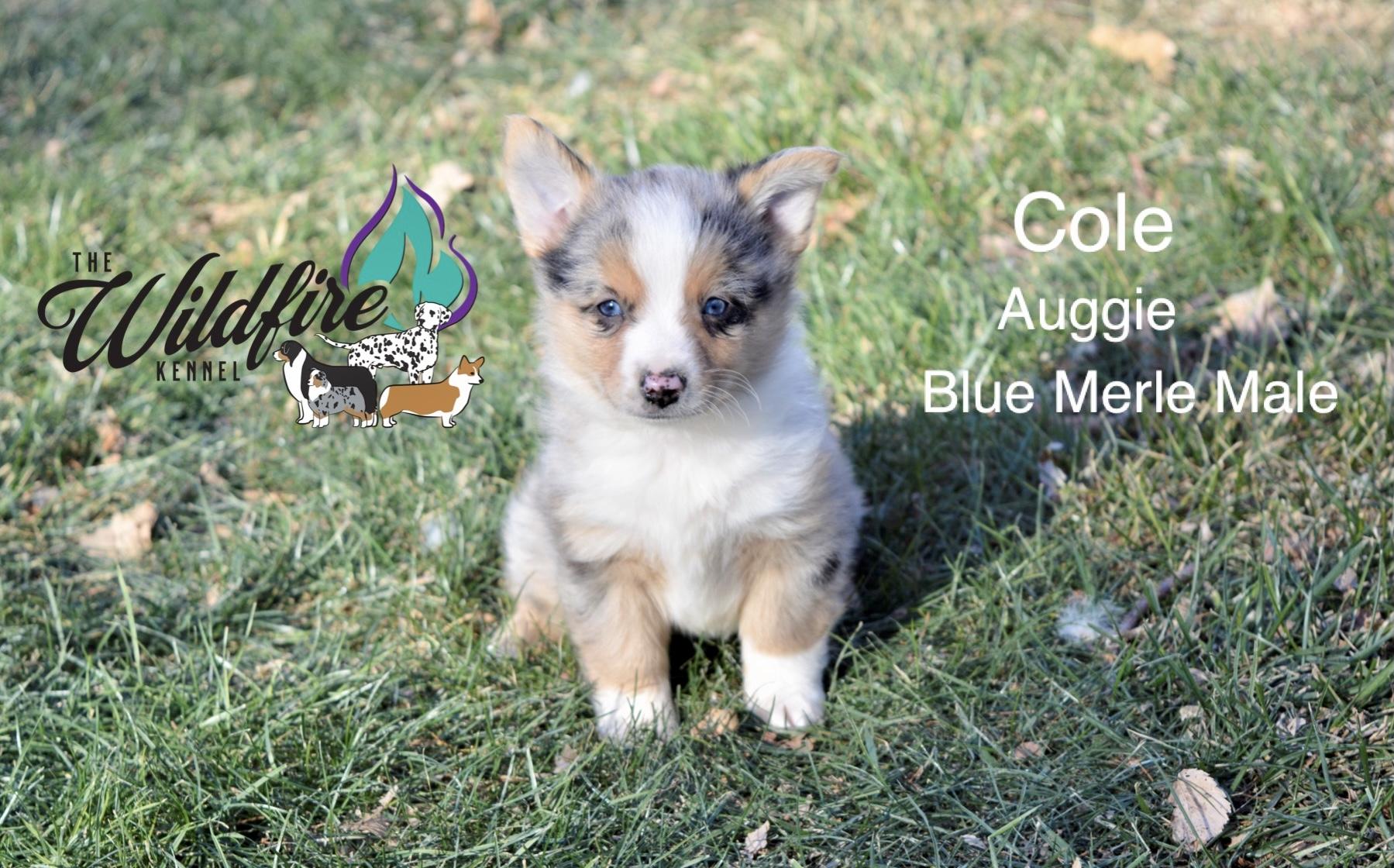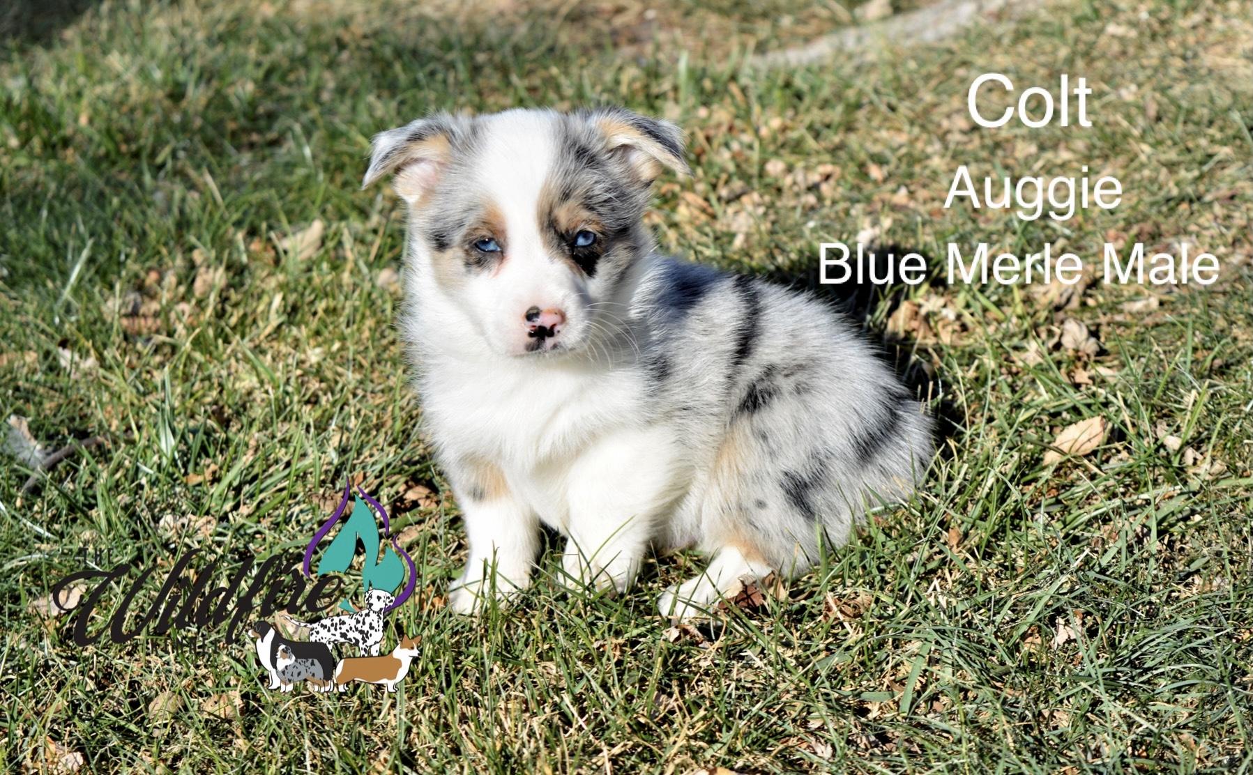 Miniature American Shepherd puppies include black, red merle, and blue merle. Pembroke Welsh Corgi puppies include fawn and sable. Colors will vary depending on the parent dogs.