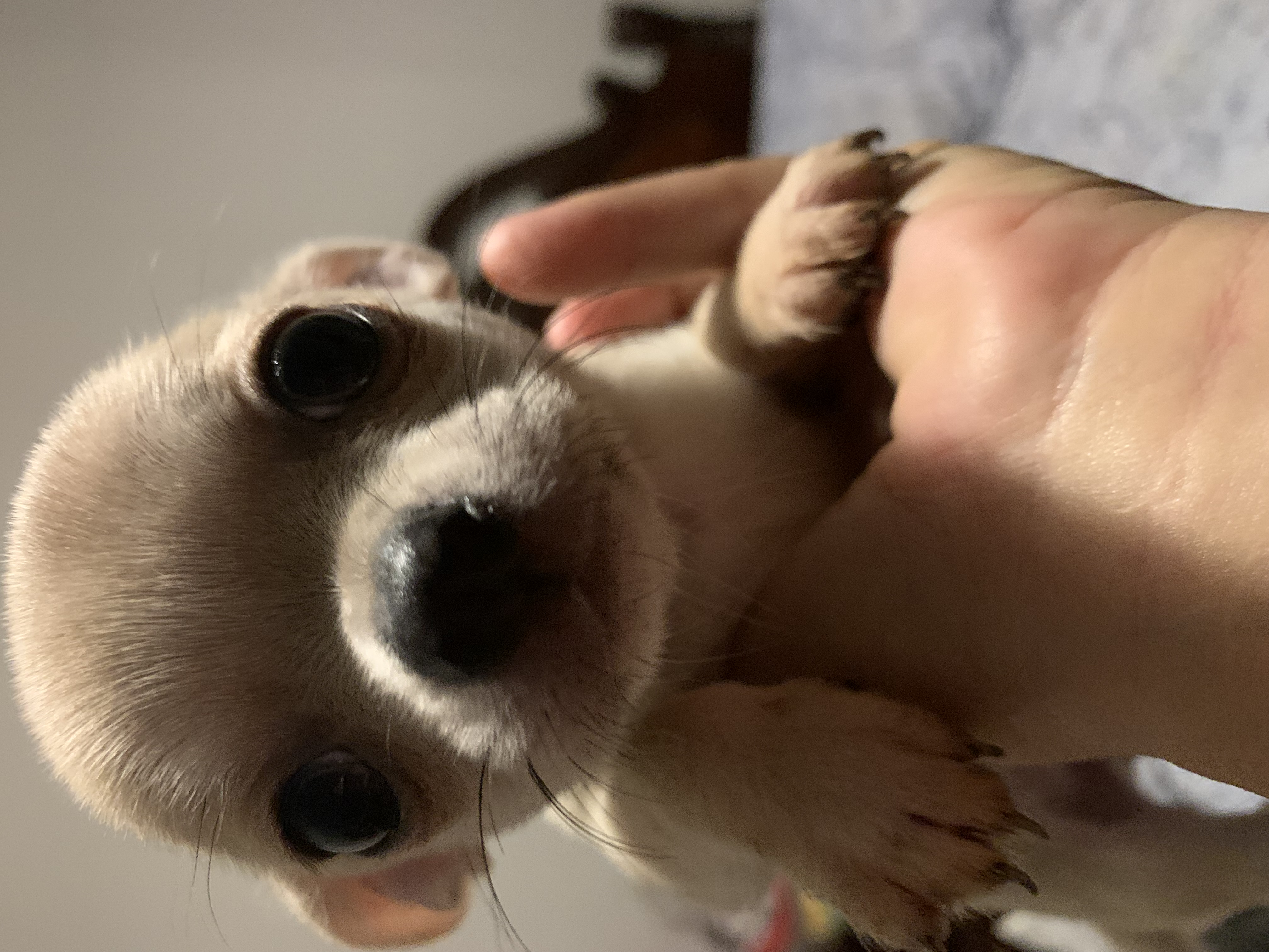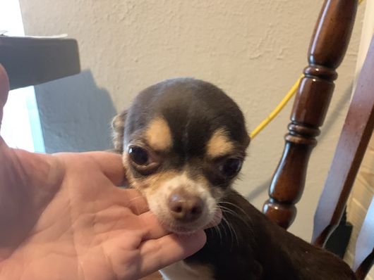 Karina very sweet Chocolate Tri smooth coat girl. She loves people and attention. Her weight is 4 lbs. She has the most adorable sweet personality.