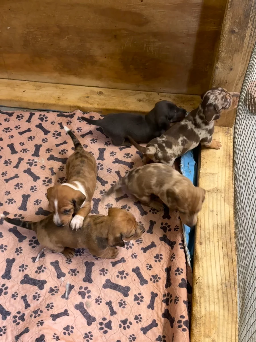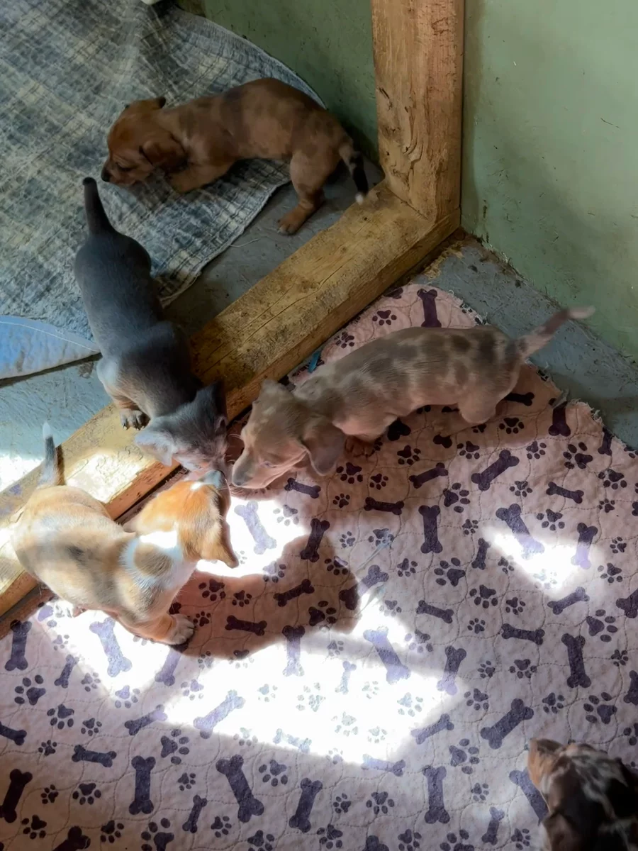The dachshund pups are 5 weeks old and learning the doggie door 🥰